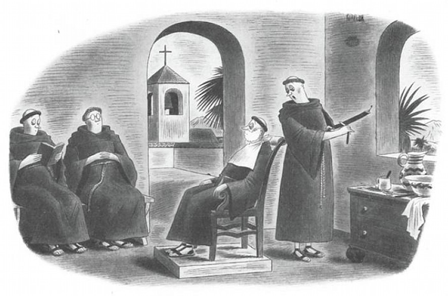„Six barbers, no waiting” „Шесть парикмахеров, без ожидания” (Рекламируют, что никогда не придется ждать в очереди, потому что у них шесть парикмахеров). Richard Taylor (1902-1970). Ричард Тейлор был канадским карикатуристом, наиболее известным своими карикатурами в журнале „The New Yorker” и в „Playboy”. „I'm Afraid It's Beginning To Show A Little On Top brother Francin” „Боюсь, что на вершине начинает показыватся, брат Фрэнсин” С 2013 г. с кайфом бреюсь опасной бритвой пять раз в неделю, в три прохода.