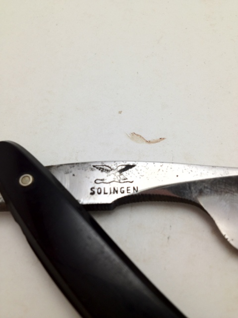 Итак: ручка не родная, "на вырост" с медыми пинами, очень похожа как у советской гравюры; отсутствие насечек на эрле, да и эрль узенький; на лезвии бритвы продольные следы устранения ржавчины наждачной бумагои и в то же время отсутствие следов абразива с торца головки (если она была отломана и потом обточена то как-то не логично); небольшой износ спинки и относительно ровная кромка....