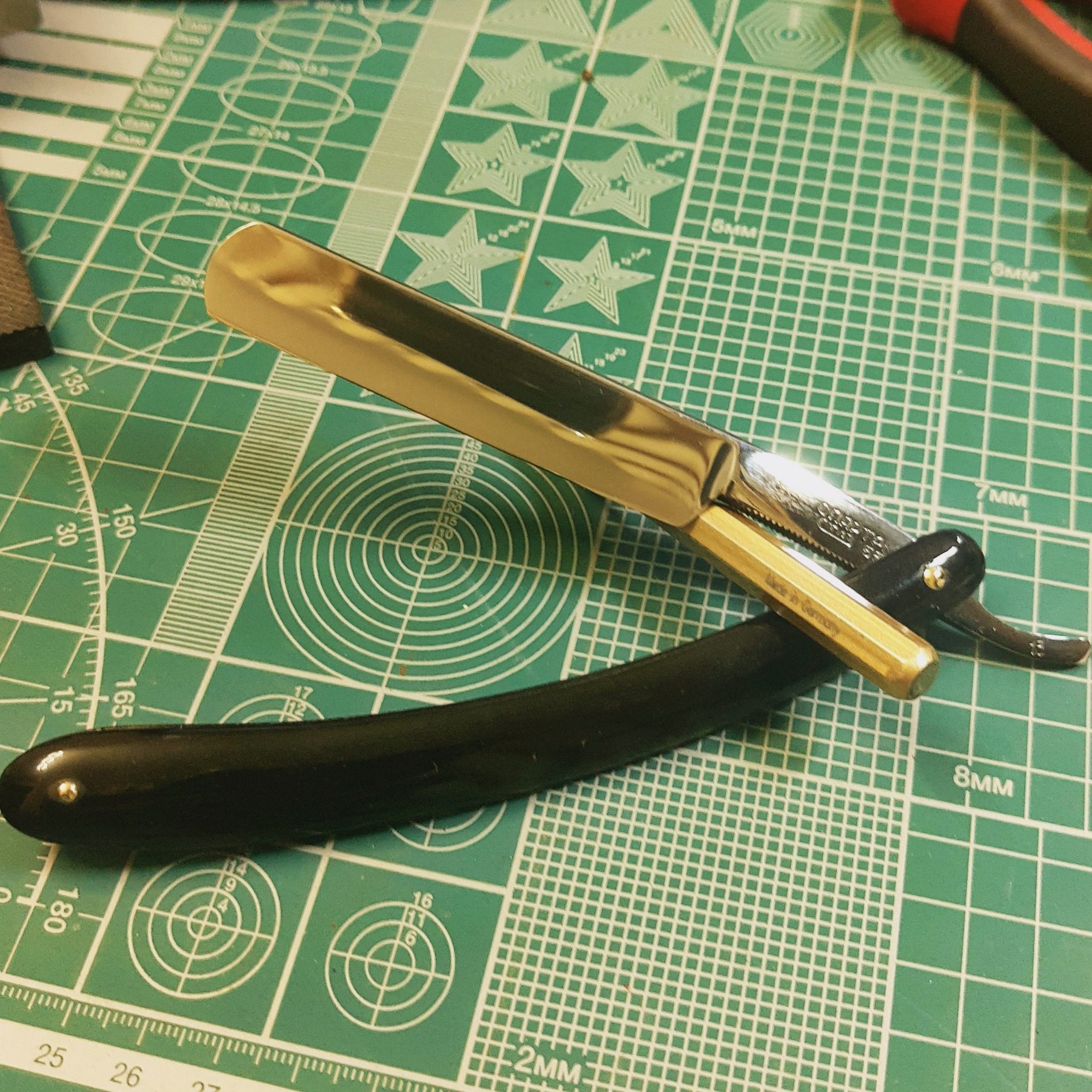 Начинающие реставраторы...Бритва была угроблена наждаком, фото "до" (с наждака), к сожалению нет, поверьте - это был ужас. Вначале работал на гриндере (первое фото), потом было "потом"
