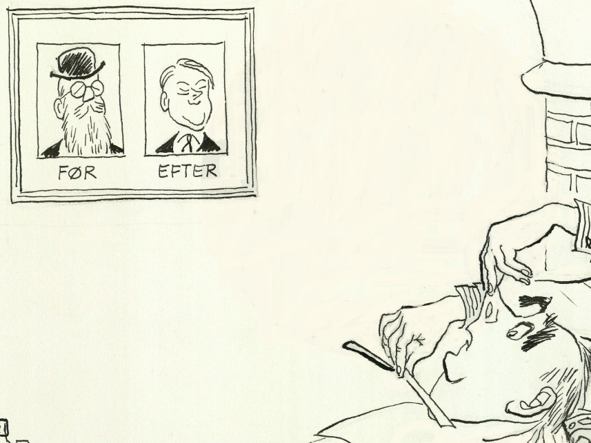 „Kniven på struben” „Нож/бритва на горле” Надпись на картине „for; efter” (до и после бритья) - эффект омоложения