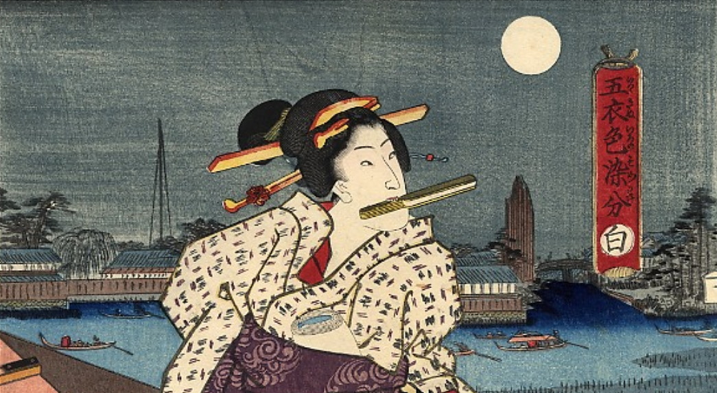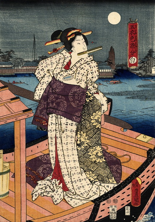 „Young lady adjusting her obi on a pleasure boat” „Юная леди поправляет свой пояс на прогулочном катере” 1850 г. Держит бритву во рту: С 2013 г. с кайфом бреюсь опасной бритвой пять раз в неделю, в три прохода.