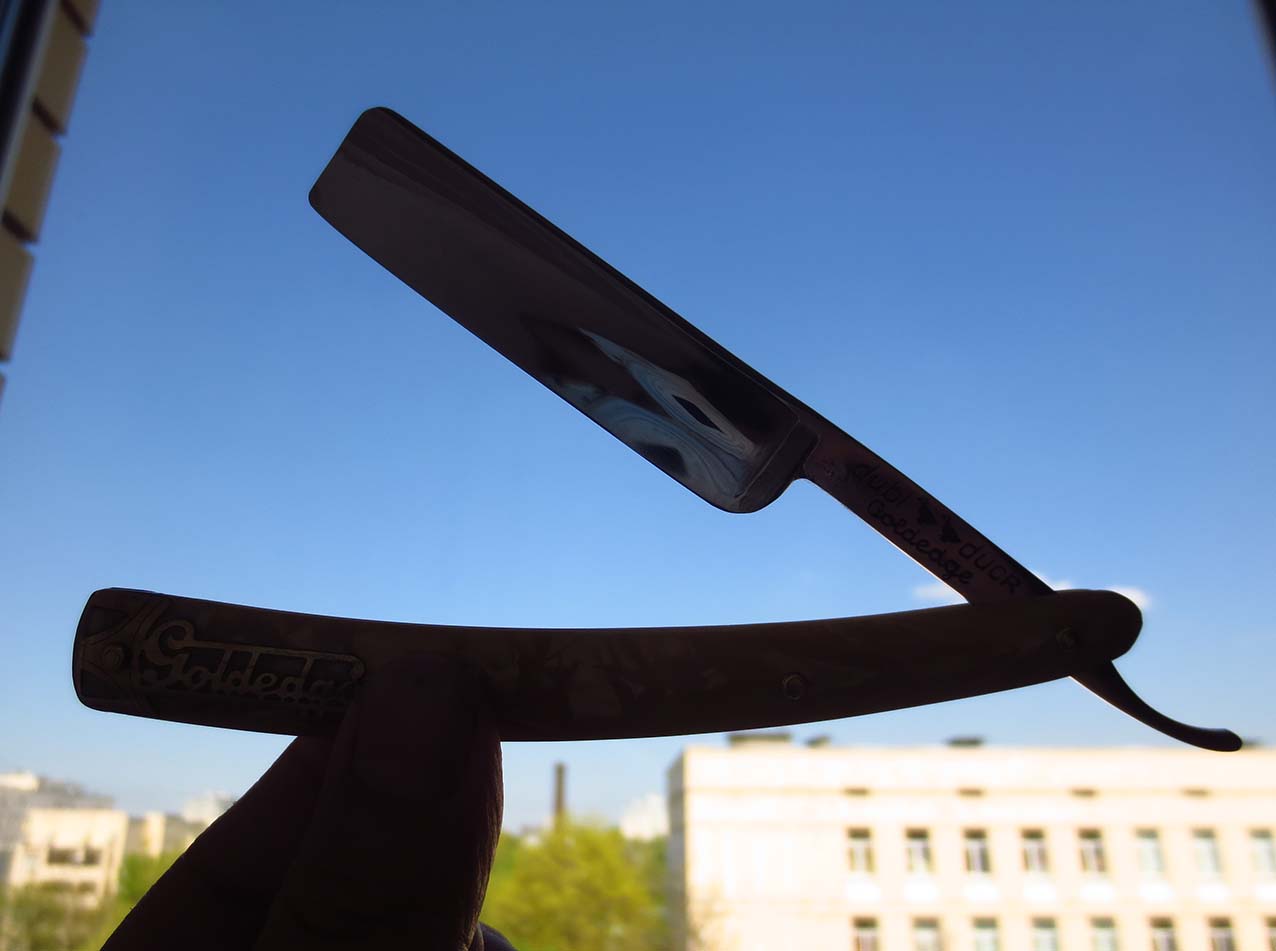 Опасная бритва "Dubl Duck" Goldedge Solingen-Germany. Углеродистая сталь, полная вогнутость, ширина полотна - 5/8 дюйма, пластиковая оправа под перламутр, всё родное, заводское. Бритва заточена на японских камнях и протестирована на себе лично. Бреет мягко и нежно, как уточка щиплет молодую травку на лужайке..)) После всех работ и тестов инструмент продезинфицирован, направлен и находится в полной готовности для борьбы с вашей щетиной. Также всегда есть в наличии ремни для правки опасных бритв из натуральной кожи, при покупке ремня и бритвы скидка на доставку. Начинающим подскажу и покажу, как пользоваться и ухаживать за утятами...) Цена - 7550 рублей. Бесит, когда приходится пользоваться бритвой моложе себя...