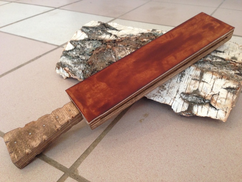 Фото по порядку изготовления: тот который с ручкой и пропилом - чистая кожа, немного маслом смазал, который без ручки, цельный - под пасту, ещё не натёр. Материал - фанера берёзовая 5 мм, 10 мм, 16 мм. Покрытие дерева - пропитка "махагон" с воском ))