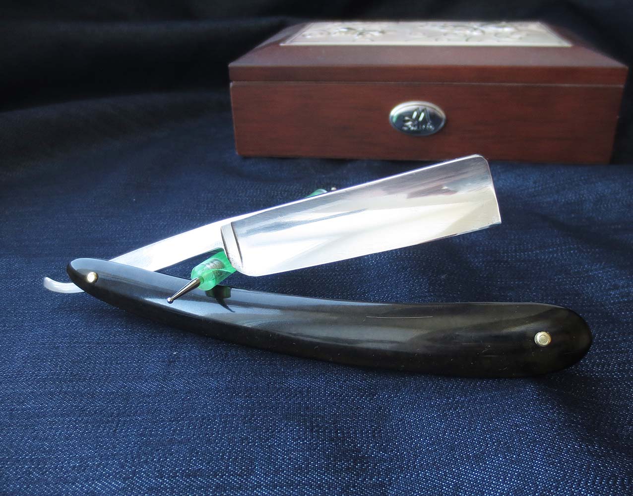 (Дамьён Фавье из Мелёна, почётный диплом), конец 19 века. Кованая углеродистая сталь, ширина клинка - 21мм, изготовлена новая оправа из киринита (карбон под чёрный перламутр), заклёпки - латунь, клинышек - олово. Инструмент заточен, протестирован на себе - бреет исключительно. После работ и тестов бритва продезинфицирована, направлена и в работе не была. Очень солидный подарок себе или дорогому для вас человеку. Цена - 7800 рублей.