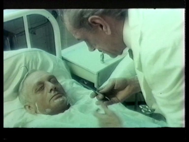 Медсестра во время бомбёжки режет простыни опасной бритвой.
