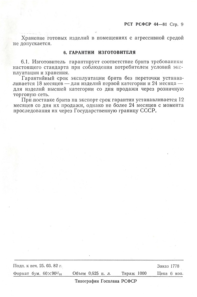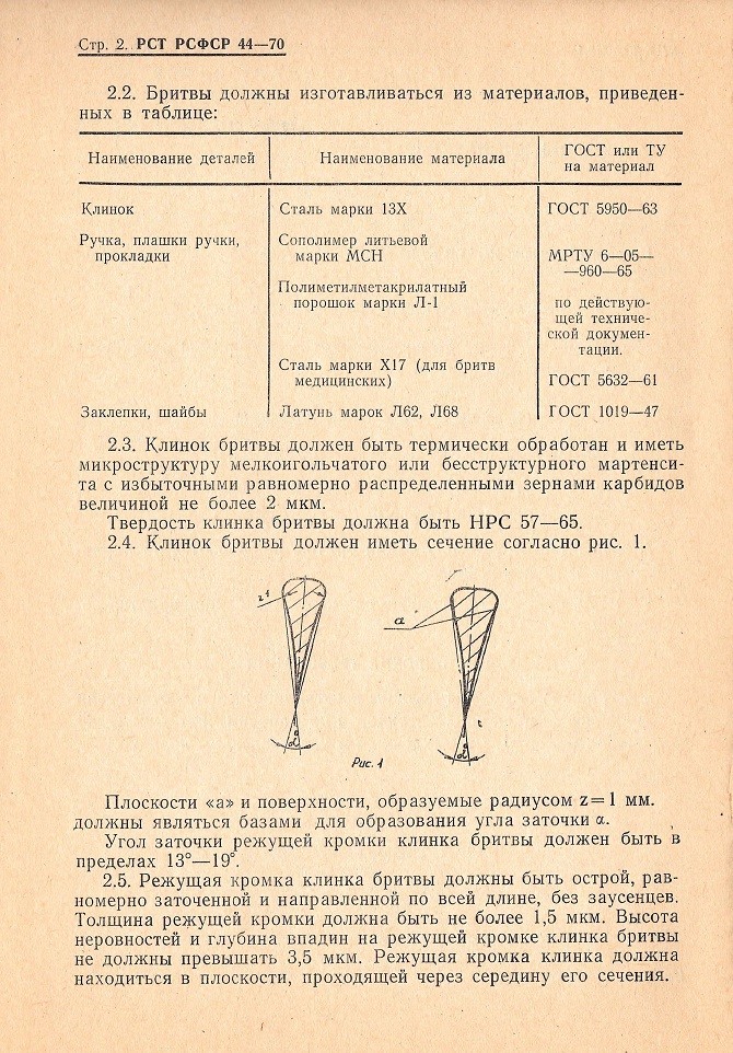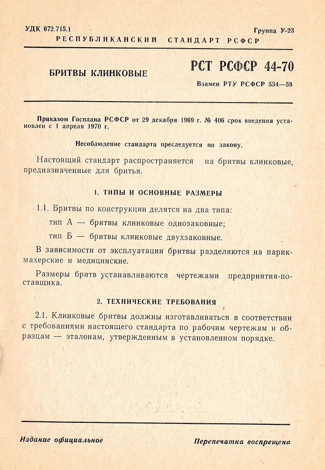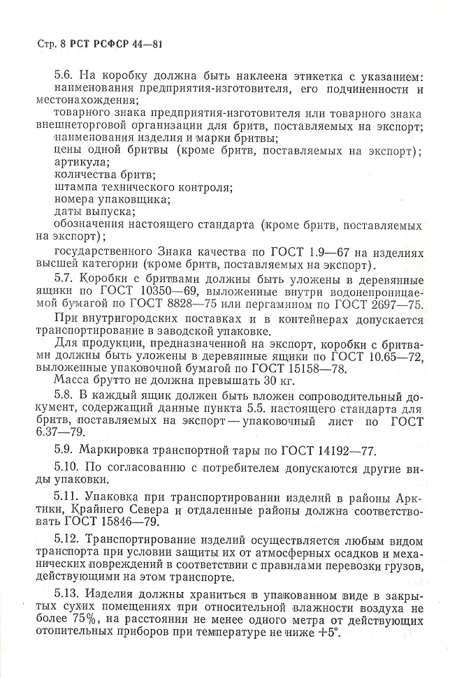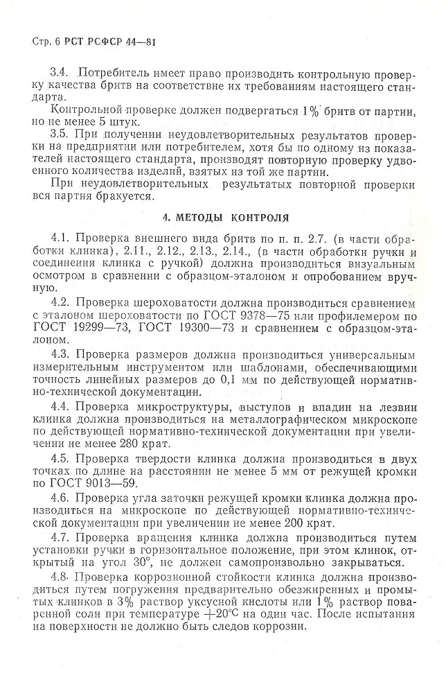 РСТ РСФСР 44-75 - дата вступления в силу: 1 октября 1976 года РСТ РСФСР 44-81 - дата вступления в силу: 1 октября 1982 года источник пока не указываю, однако данные стандарты найдены в каталоге Российской Национальной Библиотеке (Санкт-Петербург). У кого есть возможность зайти скопировать? Общие сведения по советским бритвамсрок введения установлен с 1 апреля 1970 года Основные выдержки: ТИПЫ И ОСНОВНЫЕ РАЗМЕРЫ 1.1. Бритвы по конструкции делятся на два типа: тип А — бритвы клинковые однозаковные; тип Б — бритвы клинковые двухзаковные, В зависимости от эксплуатации бритвы разделяются на парикмахерские и медицинские. Размеры бритв устанавливаются чертежами предприятия-поставщика. 2. ТЕХНИЧЕСКИЕ ТРЕБОВАНИЯ 2.3. Клинок бритвы должен быть термически обработан и иметь микроструктуру мелкоигольчатого или бесструктурного мартенсита с избыточными равномерно распределенными зернами карбидов величиной не более 2 мкм. Твердость клинка бритвы должна быть НРС 57—65. 2.5. Режущая кромка клинка бритвы должны быть острой, равномерно заточенной и направленной по всей длине, без заусенцев. Толщина режущей кромки должна быть не более 1,5 мкм. Высота неровностей и глубина впадин на режущей кромке клинка бритвы не должны превышать 3,5 мкм. Режущая кромка клинка должна находиться в плоскости, проходящей через середину его сечения. 2.6. Поверхность клинка бритвы должна быть блестящей, однотонной. Допускается разница в оттенке на ширине не более 4 мм со стороны режущей кромки. Трещины, раковины, царапины и другие поверхностные дефекты не допускаются. 2.7. Шероховатость на поверхностях, образующих режущую кромку, должна соответствовать 12 классу чистоты, шероховатость остальных поверхностей — 10 классу чистоты—по ГОСТ 2789—59. 2.8. На поверхность клинка бритвы может наноситься рисунок, надписи, расположение которых должно быть на расстоянии не менее 5 мы от режущей кромки. 2.9. Наружные поверхности ручки или плашек ручки должны быть гладкими, блестящими или матовыми. Допускается рисунок. На ручке не допускаются: трещины, заусенцы, неровности, острые кромки по контору, раковины диаметром более 0,5 мм и царапины более 5 мм длиной и 0,05 мм шириной. Количество раковин и царапин на ручке не должно быть более 3 штук. На ручке медицинской бритвы раковины и царапины не допускаются. 2.10. Цвет обоих плашек ручки должен быть одного тона. Прокладки могут отличаться от плашек как по материалу, так и по цвету. 2.11. Плашки и прокладки должны плотно прилегать друг к другу. Смещение плашек и прокладок относительно друг друга не допускается. 2.12. Клинок должен быть прочно соединен с ручкой заклепкой. Вращение клинка должно быть легкое и плавное. При закрывании бритвы режущая кромка не должна задевать за плашки ручки. В сложенном состоянии режущая кромка клинка бритвы не должна выступать за контур плашек. Самопроизвольное открывание клинка бритвы не допускается. 2.13. Концы заклепки должны быть зачеканены заподлицо с поверхностью ручки или иметь сферическую поверхность. Проверка твердости производится по ГОСТ 9013—59 в 2-х точках по длине клинка на расстоянии не менее 5 мм от режущей кромки. Проверка режущих свойств производится путем свободного срезания обезжиренного волоса, зажатого за один конец на расстоянии 10 мм от зажима. 5.1. На клинке или ручке бритвы должно быть выштамповано: товарный знак предпр