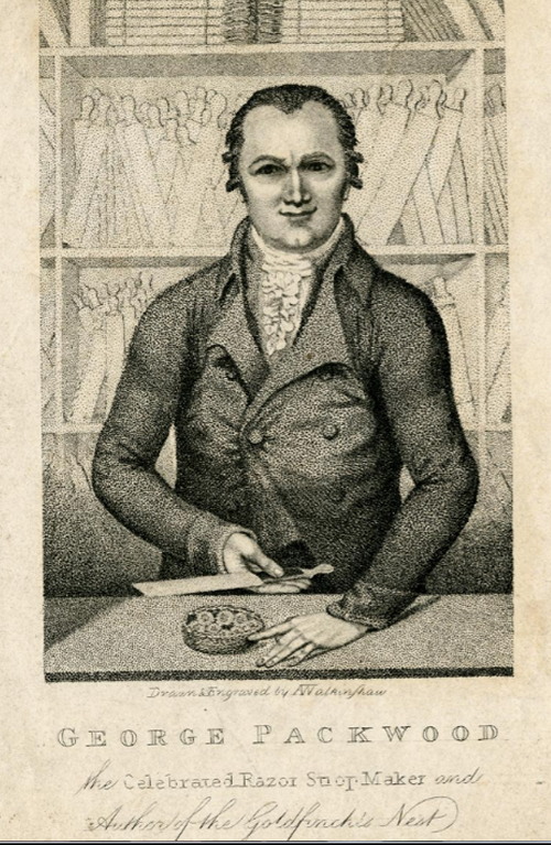 „George Packwood, The selebrated strop maker” „Джордж Паквуд, знаменитый производитель ремней” 1796 г. На заднем плане, на полках много колодочных ремней: И сново A. Walkinshaw (работал в периоде 1796-1810 гг.). А. Уолкиншоу - британский портретный гравер. „Mr. George Packwood” „Господин Джордж Паквуд” На столе колодочные ремни и непонятные цилиндрики, наверное паста: С 2013 г. с кайфом бреюсь опасной бритвой пять раз в неделю, в три прохода.