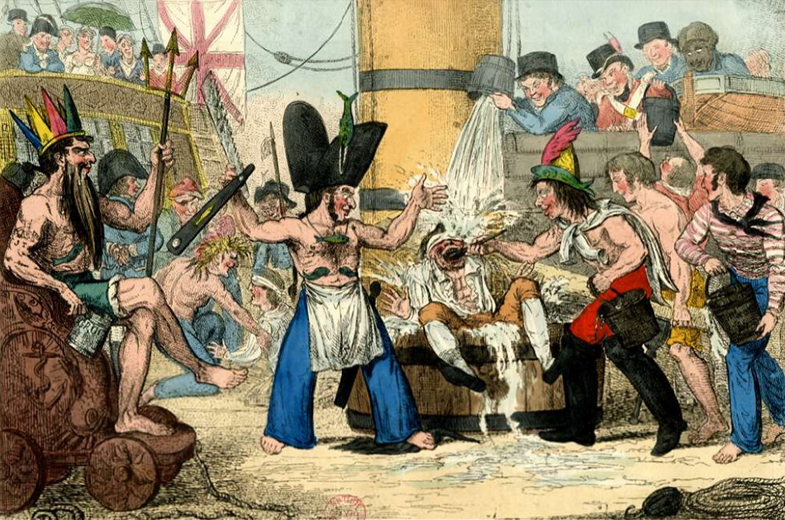 Исаак Роберт Круикшанк, иногда известный как Роберт Круикшанк, был карикатуристом, иллюстратором и портретистом-миниатюристом, менее известным братом Джорджа Круикшенка. „Sons of Neptune shaving a Landsman!” „Сыновья Нептуна бреют неопытного моряка!” 1817 г. (Юмористическая церемония, которую моряки проводят над каждым человеком, впервые пересекающим линию экватора). Взглянем поближе: С 2013 г. с кайфом бреюсь опасной бритвой пять раз в неделю, в три прохода.