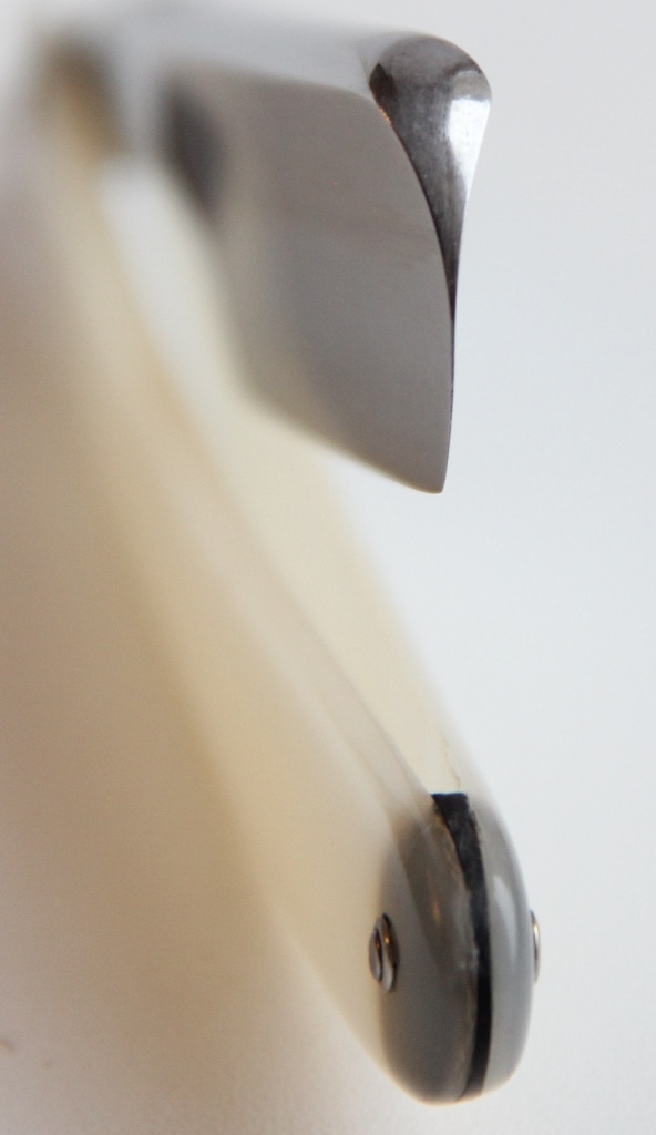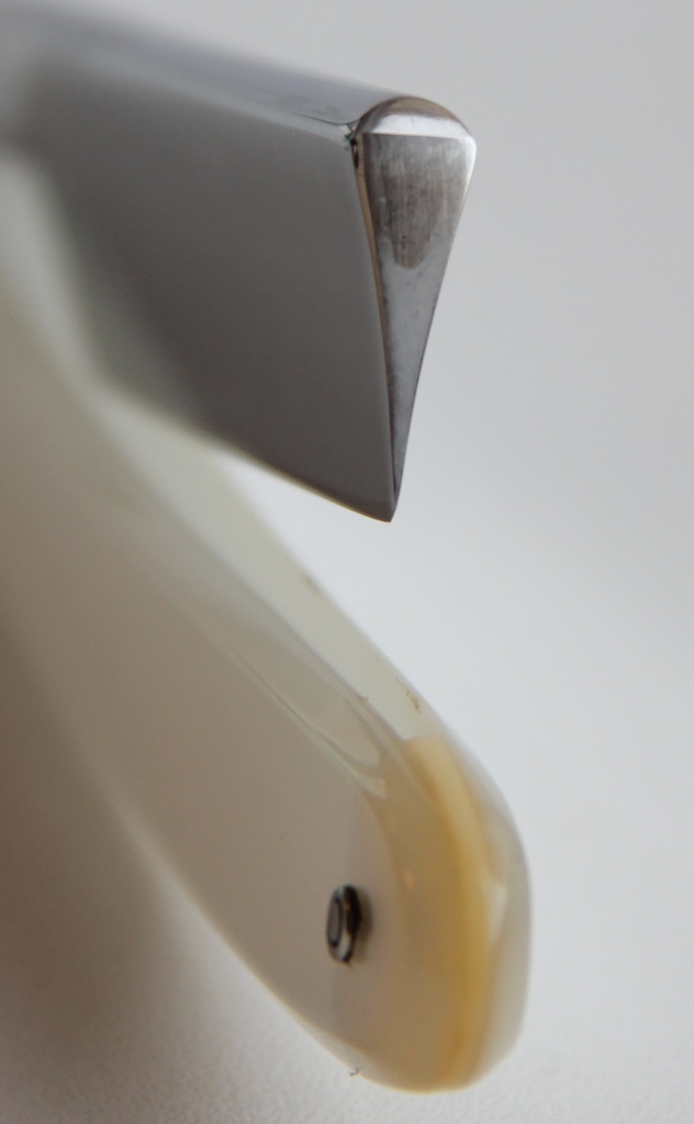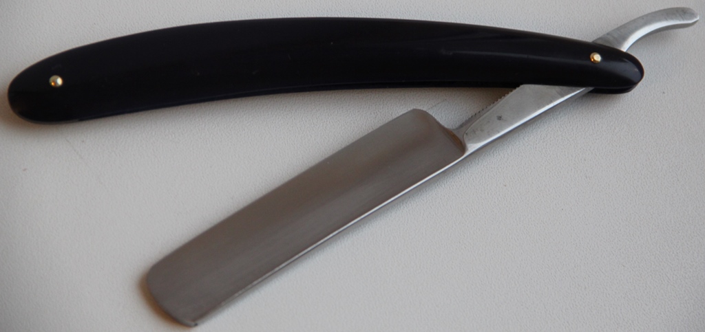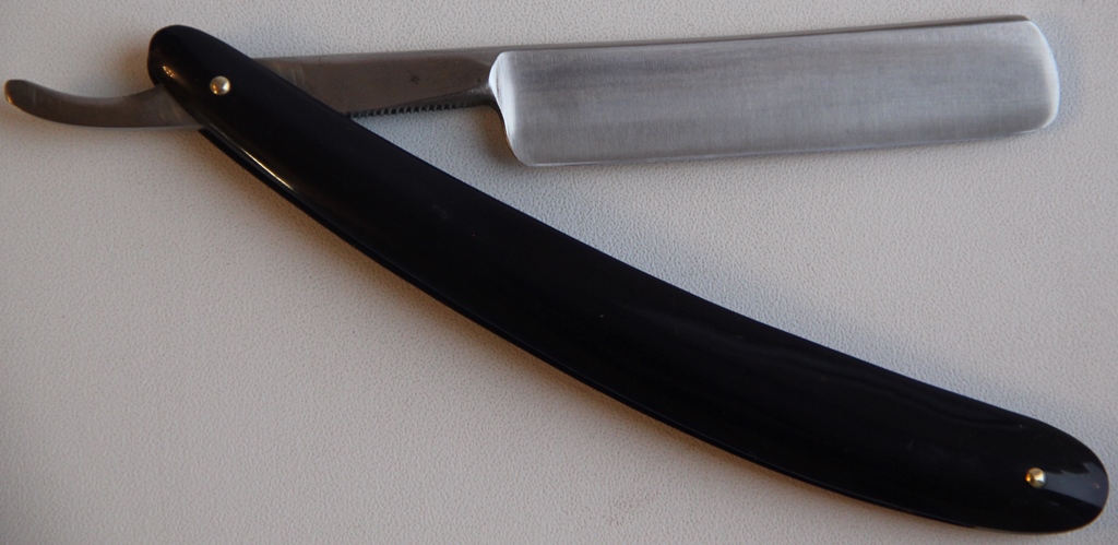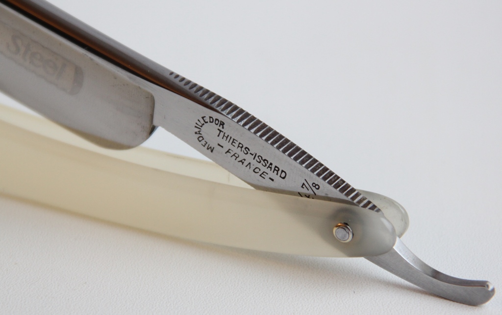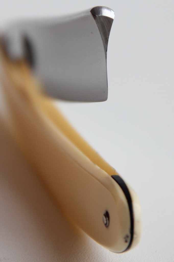 Этот шикарный, почти дюймовый экземпляр дошел до наших дней практически в идеальном состоянии, без следов пользования.(Обушок не имеет следов от заточных камней).Кроме косметической полировки вручную,чистки в районе осевого пина и замены пинов на нормальные, никаких работ больше не проводилось.Сталь и кромка чистые. Идеальная геометрия изготовления:кромочка равномерна по всей длине и еле заметна. Тяжелая. Бритьё напоминает испанскую Филармонику ранних лет:чистое, мягкое и комфортное. Такое ощущение, что не бреешься, а просто снимаешь пену с лица.Тем более, что за счет своего размера,бритва позволяет бриться практически под собственным весом. Сталь не такая твердая, как на современных Иссардах.Точится и доводится без особых проблем. Прекрасный экземпляр не только в коллекцию, но и для повседневного бритья.Имея такую бритву, можно особо больше не задумываться о рассмотрении и приобретении других вариантов, а просто получать удовольствие от француза..Бритва заточена, лично протестирована и полностью готова к пользованию.