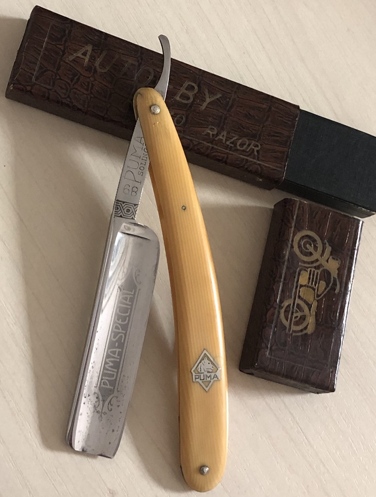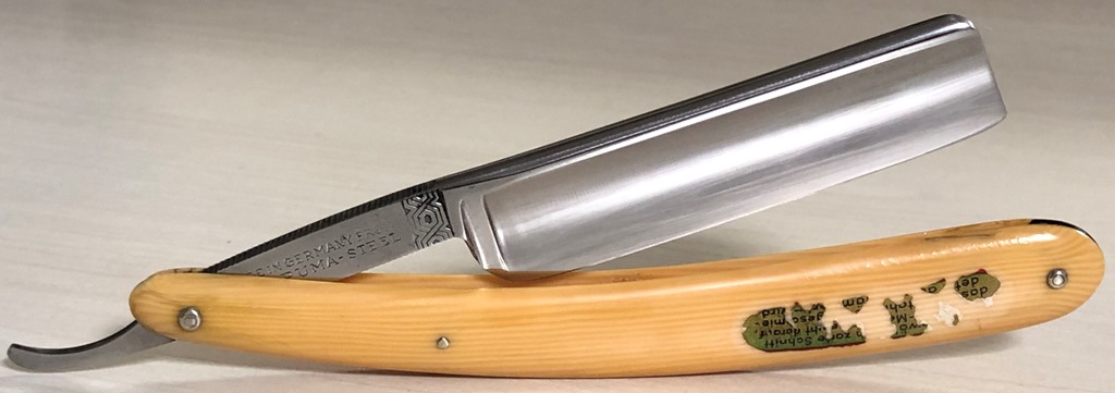 Бритва в пользовании не была, но пришлось немного освежить металл от патины. Родную оправу от времени повело в разные стороны, поэтому я решил ничего не выпрямлять , а поставил совсем уж старинную пластиковую ручку, от немца, начала 20-го столетия.Стальные родные пины удалось сохранить и заново поставить. Получилось весьма недурно, как мне кажется.Бритва тяжёлая,с отличной сталью. Брить будет очень даже неплохо. Заточена и готова к бритью.