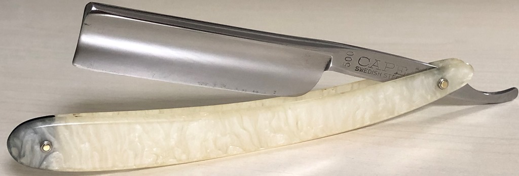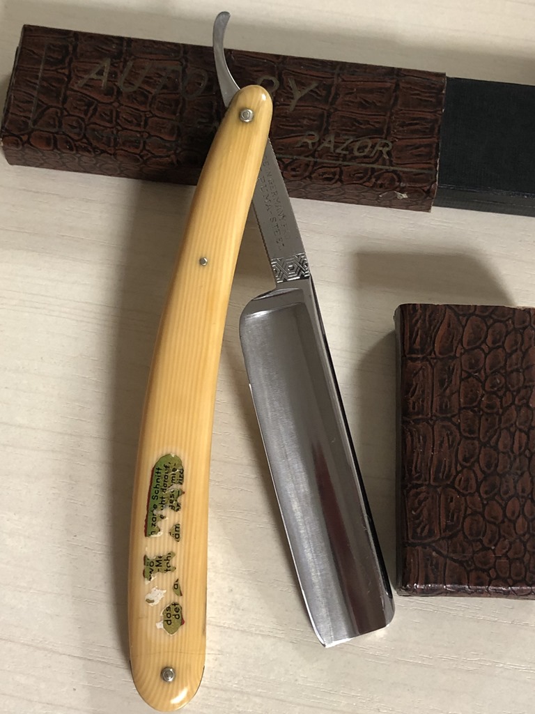 Бритва в прекрасном состоянии, без видимых следов пользования. Разобрал, немного прошёлся самыми тонкими абразивами и снова собрал, заменив пины на немецкие двух-цветные втулки, с добавлением внутренних шайб. Родная оправа также в отличном состоянии. Идеальная геометрия:кромочка равномерна по всей длине и еле заметна. Отличный, достаточно редкий экземпляр, в таком сохране. Не пропустите очень хорошую и недорогую вещь.