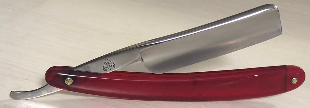 Красивая и практичная бритва.Поменял осевой пин, так как закрывалась бритва криво изначально, заодно и второй пин заменил, для порядка.Клинок не имеет следов пользования.Немного освежил металл и все. Идеальная геометрия. Кромочка равномерна по всей длине.За счет пластиковых накладок бритва не требует излишнего ухода, да и эстетически смотрится очень приятно.Клинок среднего размера, скупе с довольно ощутимым весом будет отличным вариантом для новичка и не только.Заточена и готова к бритью.