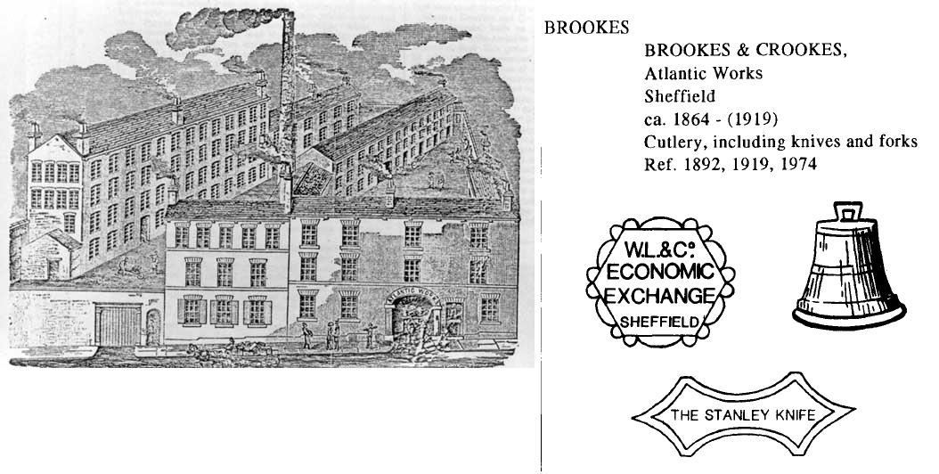 Re: "Brookes&Crookes", Sheffield.В 1858 году к John Brookes присоединился Thomas Crookes, и они приобрели склад, мастерские, моторный дом и шлифовальню позади дома № 58 на улице St. Philip's Road. Завод, Atlantic Works, ранее был адресом Томаса Вигфелла(Thomas Wigfall). В 1859 году Brookes & Crookes появились в Melville's Commercial справочнике Шеффилда как производители пружинных ножей и инструментов для одежды(? - dressing case instruments). John Brookes умер 14 февраля 1865 года, в возрасте только 39 лет. Thomas Crookes занял этот бизнес. У него было мало непосредственного опыта в торговле столовыми изделиями, и он предоставил эту работу своему менеджеру William Westby, который стал партнером фирмы после смерти Brookes в 1865 году.