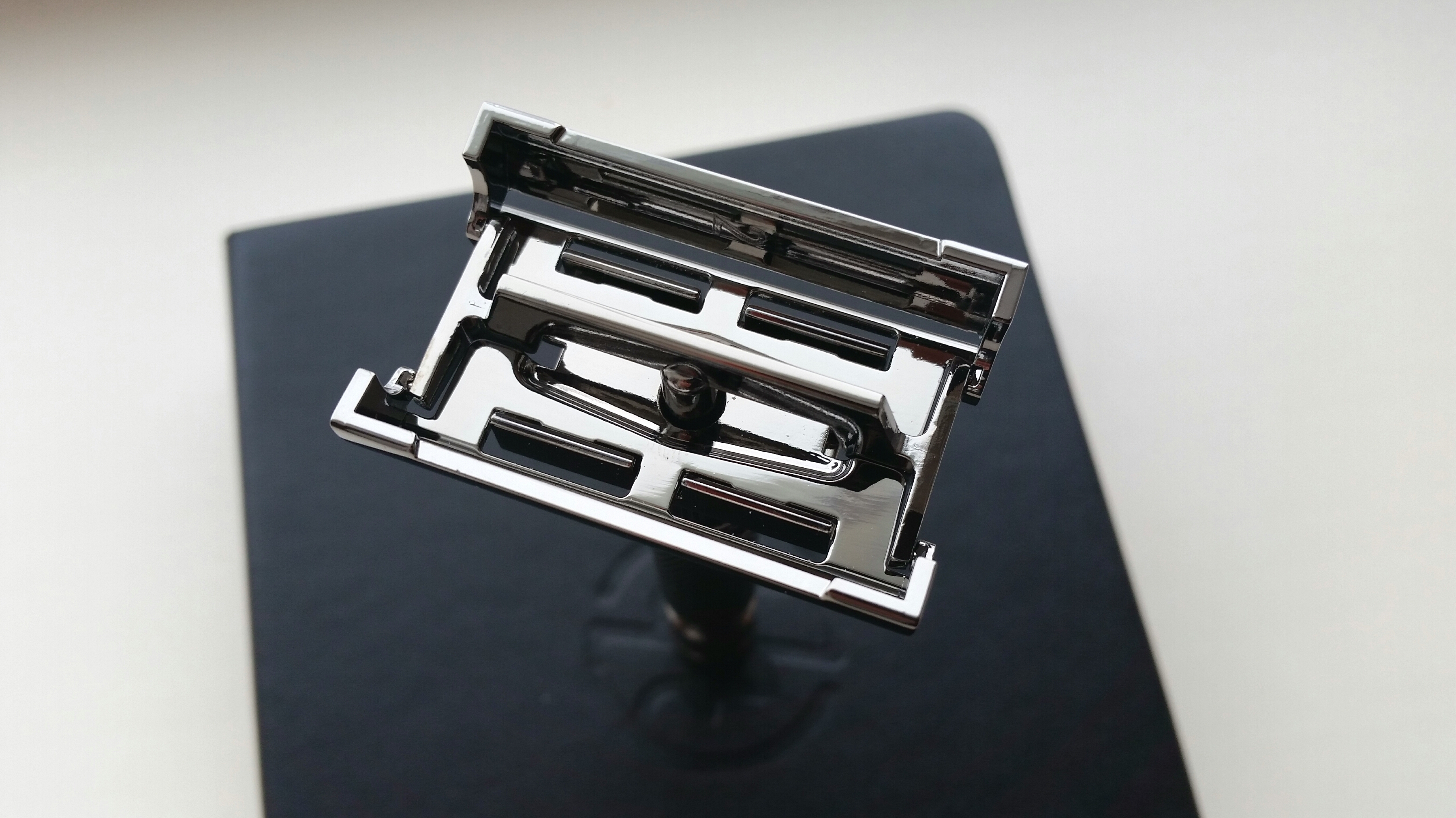 Механизм "бабочка", по принципу открытия и регулировки схож с Джиллетт и советскими копиями - поднятие и опускание опорной плиты (которая давит на лезвие снизу) с изменением гапа, вылета и наклона лезвия. Створки открываются/закрываются равномерно, кольцо регулировки тоже вращается плавно и с достаточным усилием. В закрытом виде можно вращать кольцо на понижение, на повышение я пробовал, но почувствовал сопротивление и прекратил (лучше чуть приоткрою механизм). Можно ставить любые промежуточные значения регулировки, в джиллетоподобных все значения фиксированы (1-9) и переключаются со щелчком. Тут же можно более точно подстроить под себя, что явно плюс, хотя и в варианте со щелчками регулировка обычно происходит с небольшим шагом изменения.