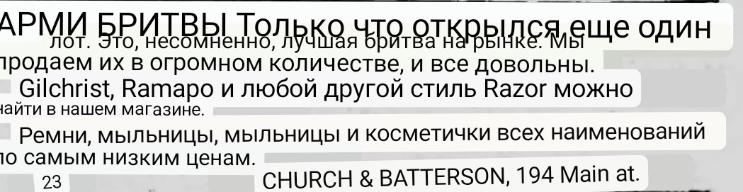 Адрес в Джефферсонвилл, штат Индиана вероятно принадлежал дилеру R.H. Gresham's Emporium, который продавал, в том числе и бритвы Гилкриста.