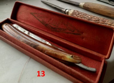 35 - HENN SOLINGEN. Когда-то был шикарный немец с позолотой и заводским файлворком на обушке. Бритва моего дедушки, с его лет службы ГСВГ. Ко мне попала в состоянии сквозной коррозии полотна в районе РК... Так что от бритвы здесь только бокс и оправа с красивого целлулоида с розовым отливом и заводской инкрустацией на оправе.