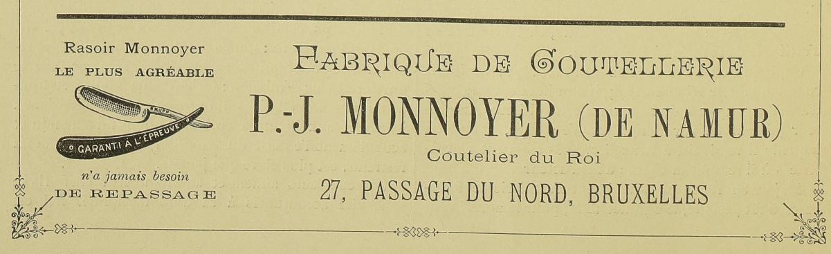 вот реклама, 1893 год: В общем можно и покопать. А где бритва? В справочнике Camille Pagé найден ещё один интересный отрывок о Намюре: «Производство столовых приборов в Намюре значительно сократилось; к середине XIX века там всё ещё оставалось несколько производителей, среди которых был Жозеф-Пьер Моннойе, чьи работы выставлялись в Лондоне в 1851 и 1862 годах, а также в Париже в 1855 году». (Перевод)