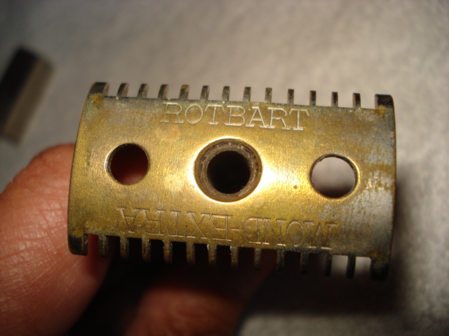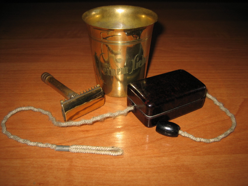 1. Никелированная коробочка с вращающейся ручкой сбоку. Под крышкой внутри - два кожанных валика и между ними зажим для лезвия. При вращении ручки поочередно вращались валики и закрепленное лезвие. Таким образом правилось (я полагаю) сменное лезвие бритвенного станка.