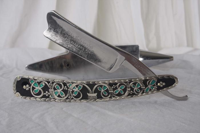 Но потихоньку, в осознанием процессов, втянулся и всё-таки сделал. Я не спец по такого типа работам, поэтому первая работа далась диким терпением, снимал лак и краситель 4 раза и тонировал и покрывал лаком снова. Получалось не то что хотел. Но вроде справился, хочу поделится. Тема такая - есть две бритвы DOVO и Thiers Issard. На DOVO ручка родная (модель такая). Задача поставлена заказчиком сделать на Thiers Issard в этом же стиле, а головку обеих бритв как на рисунке ниже: Вот что получилось. Бритвы режут волос и на повороте, до самого кончика. Чтобы кончик править, надо пройти обучение у меня. Ну и всё остальное (большой пин с орнаментом на ручке моего производства): Spoiler Show Ремонт опасных бритв, звонить с 11-00 до 23-00, +79267729357, (viber, whats app, telegram, VK), спросить Олега.