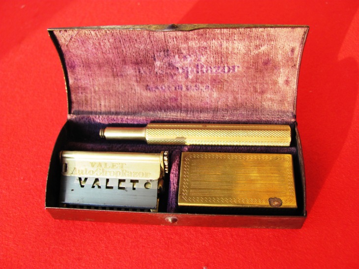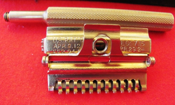 Комплектация: 1.Оригинальная коробка металлическая. 2. Станок (металл жёлтого цвета, но не золото 3. 4 запасных лезвия в пакетиках (London, England). 4. Коробочка для лезвий (металл жёлтого цвета) Цена комплектного станка 45 евро с учётом пересылки. ПРОДАНО