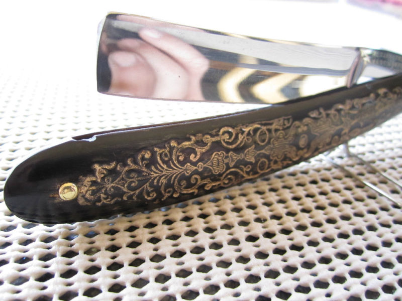 Что же касается цены... Популярность в мире на WADE & BUTCHER за последнее десятилетие сильно возросла и сейчас даже не реставрированные не убитые бритвы трудно найти дешевле 200 баксов, а реставрированные уходят за 300-500 и выше в зависимости от самой бритвы. Тут же мы имеем просто отличную бритву с очень удобным для собственного пользования (а не для брадобреев) размером, что для этой фирмы и возраста достаточно редки (обычно не менее 7/8), да и качество реставрации крайне высоко. Конечно пины тут не родные! Её же реставрировали, значит и пины меняли. Если бы это было бы не так - в районе пина на клинке были бы заметны небольшие потемнения (не разбирая бритву сложно там всё досконально почистить). А ручка родная, из рога - это хорошо видно на последней фотке и на 4й (там скол идёт на ручке, бакелит так не скалывается, только рог). Re: WADE & BUTCHERm-s-r, ручка - прессованный рог.