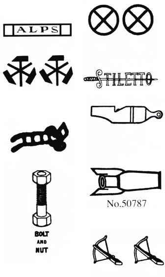 Korten (зарег. в 1900 году, No.45942), DORCAS (зарег. в 1902 году, No.53743), NONETA (зарег. в 1903, No.59060), ROGA (зарег. в 1903 году, No.60792), AGLOS (зарег. в 1903 году, No.61692), Alps (Альпы) (зарег. в 1923 году, No.307007), Bismarcksäule (башня Бисмарка), Bolt and Nut (болт и гайка), Dorcas, General Creagh, Crossbow (Арбалет), Kaiser-I-Hind, La Primera del Oriente, Retsabla, Scherfko, Securitas, Stiletto, Taj Mahal.