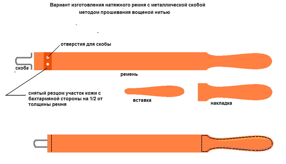 однако есть более бюджетные варианты с не менее выдающимися результатами, например кожа с хребтовой части быка или буйвола, по русски – чепрак, по буржуйски – buff. Выбор кожи КРС, основан на достаточной толщине, слабо выраженном кожном рисунке, отсутствии крупных пор от ворса, достаточно плотной, равномерной структуре и плотности переплетения эластиновых и коллагеновых волокон, удовлетворительной степени вторичных связей между волокнами возникающими в процессе дубления и жесткости заготовок. Есть конечно варианты с выдающимися качествами, типа кожи нерпы или тюленя, но они для гиков, а не среднестатистического пользователя опасной бритвы. Можно купить готовые ременные заготовки. Желательно, чтобы кожа была растительного дубления, т.к. при смешанном или же при хромовом дублении кожа остается пропитана солями хрома, которые попадая на сталь вызывают ее усиленную коррозию, да и сам ремень покрывается черно-рыжими разводами и выглядит неэстетично. Размеры заготовки могут быть разными, но удобнее пользоваться ремнем с шириной не менее 50 мм. , длинной не менее 350 мм., толщиной не менее 3 мм. Кожа должна быть гладкая с лицевой стороны и умеренно плотная, ни в коем случае не рыхлая с бахтармяной стороны, равномерная по толщине. Вопрос цвета я считаю неважным, однако по возможности лучше выбрать некрашеную кожу. Прежде всего необходимо определиться с размерами ремня, особенностями конструкции и требованием к фурнитуре. Ремень может иметь металлические кольца, полукольца, карабины, петли, накладки, утолщения, ручки для удержания и натяжения, а может не иметь их. Кроме того конструкция ремня может быть скреплена хольнитенами(заклепками), блОчками, скобами (рис.1). Элементы ремня могут быть прошиты вощеной нитью или склеены клеем. Ремень может иметь дополнительную стропу из кожи или тканевую из льна, пеньки или джута. Итак, определились с конструкцией и размерами ремня. Далее вырезаем (отрезаем) необходимой длинны заготовку с учетом особенности конструкции, можно резать канцелярским ножом, я режу хирургическим резекционным, он удобнее, затем обрезаем грани тем же канцелярским ножом или специальным инструментом-кромочником из маникюрного набора в виде маленькой двузубой вилки с заточенной «промежностью» (рис.2). После обрезки граней обе стороны ремня шкурим наждачкой, лицевую номерами от 400 до 2000, бахтармяную достаточно номером 400. Подготавливаем фурнитуру, оправки для нее, вощеную нить, хирургическую иглу № 6 – 8 с режущими гранями и пружинным ушком, разметочник по коже, шорное шило круглое и трехгранное с режущими гранями, пробойник. Частный пример изготовления подвесного ремня со скобой и ручкой для удержания, прошитый вощеной нитью: 1. Вырезаем из обработанной заготовки контур ремня, накладку и вставку (рис.3) 2. Приклеиваем накладку к ремню. 3. Размечаем разметочником (рис.4) отверстия для шитья и прокалываем шилом сквозные отверстия. 4. Прошиваем ремень и накладку начиная с угла «полуторным швом» (рис.5) половину ручки для удержания, вставляем накладку и шьем до конца по периметру. Заделываем шов. 5. В месте крепления скобы выбираем острым резаком с бахтармяной стороны кожу до половины толщины (рис6). Пробиваем пробойником отверстия для скобы. Вставляем скобу и прошиваем, заделывая концы нити между слоями кожи. 6. Вощим края ремня, чтобы 