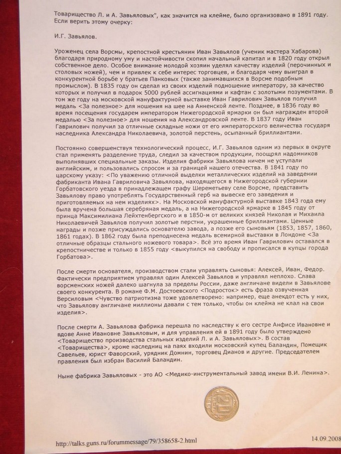 Уроженец села Ворсмы, крепостной крестьянин Иван Завьялов (ученик мастера Хабарова) благодаря природному уму и настойчивости скопил начальный капитал и в 1820 году открыл собственное дело. Особое внимание молодой хозяин уделял качеству изделий (перочинных и столовых ножей), чем и привлек к себе интерес торговцев, и благодаря чему выиграл в конкурентной борьбе у братьев Панковых (также занимавшихся в Ворсме подобным промыслом). В 1835 году он сделал из своих изделий подношение императору, за качество которых и получил в подарок 5000 рублей ассигнациями и кафтан с золотыми позументами. В том же году на московской мануфактурной выставке Иван Гаврилович Завьялов получил медаль «За полезное» для ношения на шее на Анненской ленте. Позднее, в 1836 году во время посещения государем императором Нижегородской ярмарки он был награжден второй медалью «За полезное» для ношения на Александровской ленте. В 1837 году Иван Гаврилович получил за отличные складные ножи от его императорского величества государя наследника Александра Николаевича, золотой перстень, осыпанный бриллиантами.