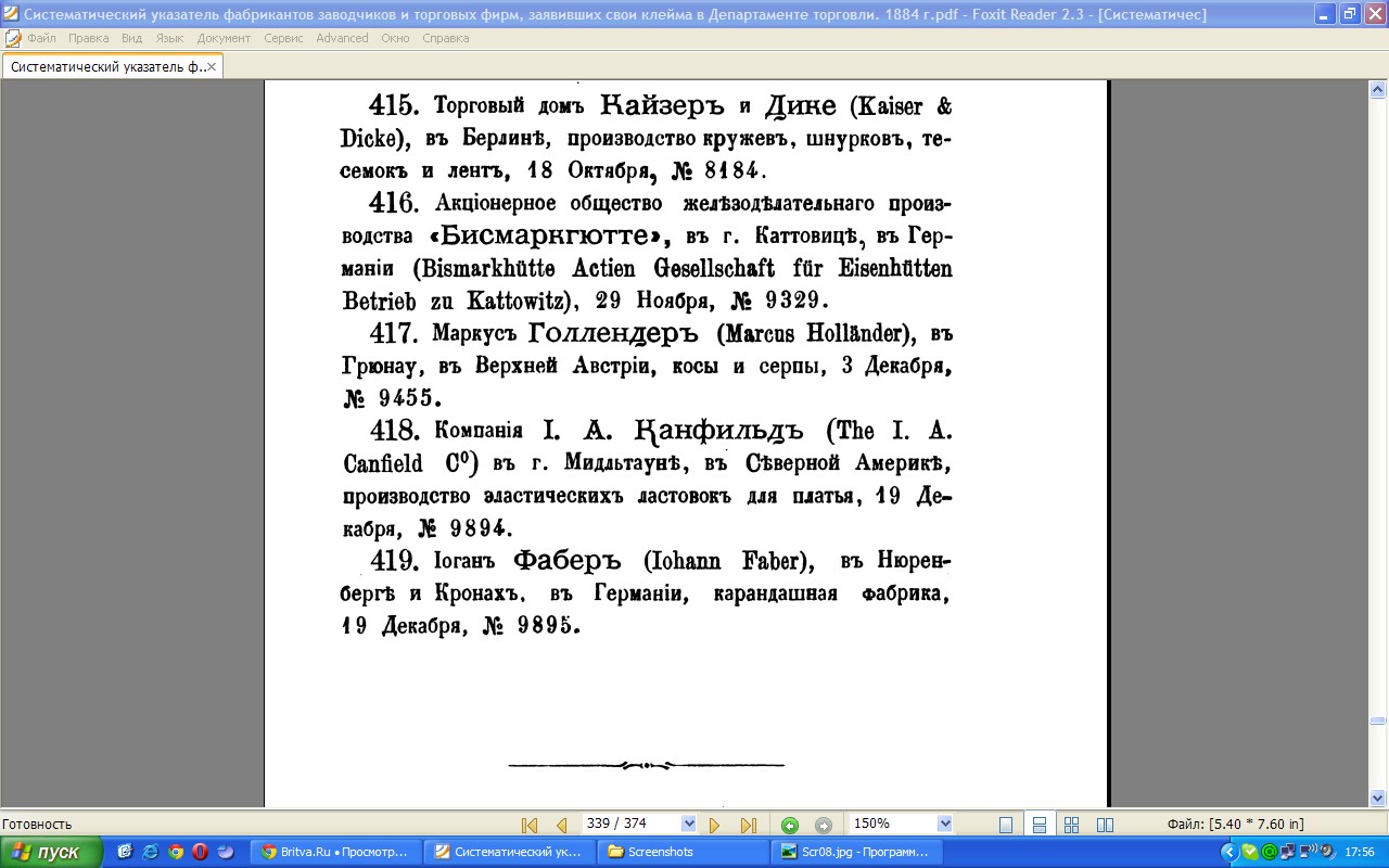 http://books.google.ee/books?id=f7oZAAA ... &q&f=false http://books.google.ee/books?id=1Ig4aVz ... 85&f=false http://books.google.ee/books?id=zUhC2xM ... BC&f=false Российский закон о товарном знаке был принят 25 февраля 1896 года и действовал до Октябрьской революции. В этом документе подробно оговаривалась процедура регистрации знаков, определялись сроки их действия и меры по защите товарных знаков. Для регистрации знака необходимо было подать заявку в Департамент промышленности, мануфактур и торговли. Свидетельство о регистрации выдавалось на срок от одного года до десяти лет. http://www.tovarnyeznaki.kz/ru/interes_6.php Систематическïй указатель фабрикантов, заводчиков и торговых фирм, заявивших свои клеǐма в Департаментѣ торговли и мануфактур http://books.google.ee/books?id=82FIAAA ... imilarbook Свод данных о фабрично-заводской промышленности в Россіи за ... год http://books.google.ee/books?id=pYUuAAA ... milarbooks http://books.google.ee/books/about/%D0% ... edir_esc=y см. Похожие книги, много интересного /attachment Подборка литературы по торговле в Царской России датирование бутылки со столь близким по номеру патентом Show