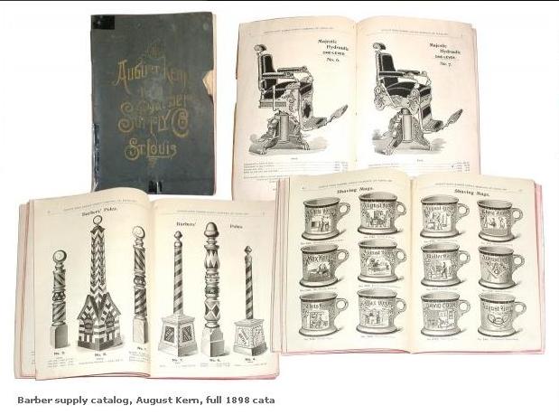 Barber supply catalog, August Kern, full 1898 catalog w/chairs, furniture, occupational mugs, poles, etc., 2 color plates for William's Shaving Soap, VG cond., 10"H x 7"W.