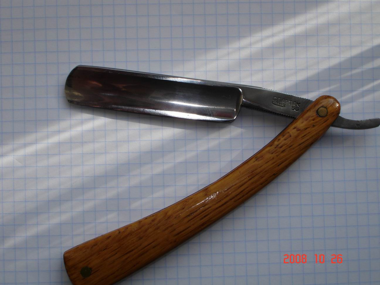 Досталась от деда , ручка была изготовлена из пластика который просто раскрошился, заменил морёным дубом довоенного возраста .Полотно было не лучше ручки , за неделю вылезал , и ещё около 2 лет ушло на то , что бы она начала нормально брить