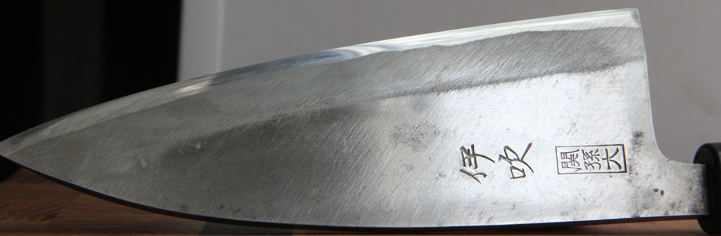 Вот такой кухонник хочу предложить сегодня. Нож достался от старого японца из Киото. По его словам, находился в его семье очень много лет. Не уточен, ухожен. Сталь-углеродка. Какая именно-Аогами или Широгами-не знаю. Сталь требует определённой культуры пользования и особого внимая, т.к. ржавеет мгновенно. Но, режет как... :roll: Предназначен для разделки рыбы, курицы, мяса.При качественной заточке прекрасно справляется с тонкой нарезкой помидоров, колбасных изделий и т.д.