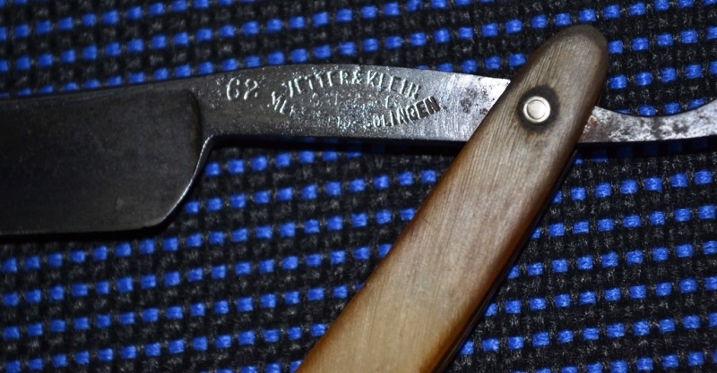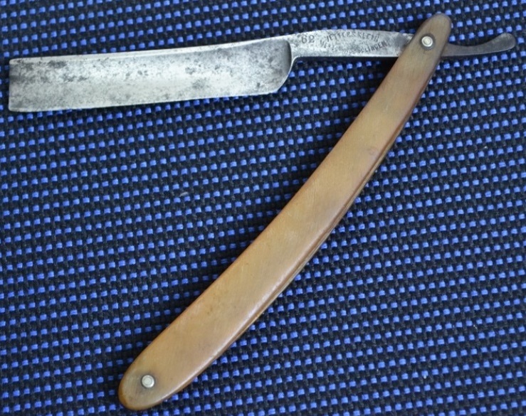 Часть букв клейма трудно разобрать, но написано следующее: вверху цифра 62 и надпись Vetter&Klein, по центру - Garantie, внизу Merss* LTD-Solingen (*- не видно букву). С обратной стороны клеймо: буквы V и K с изображением клинка бритвы. Ручка рог. Клинышек - пока не понятно. Может темный рог, может пластик.