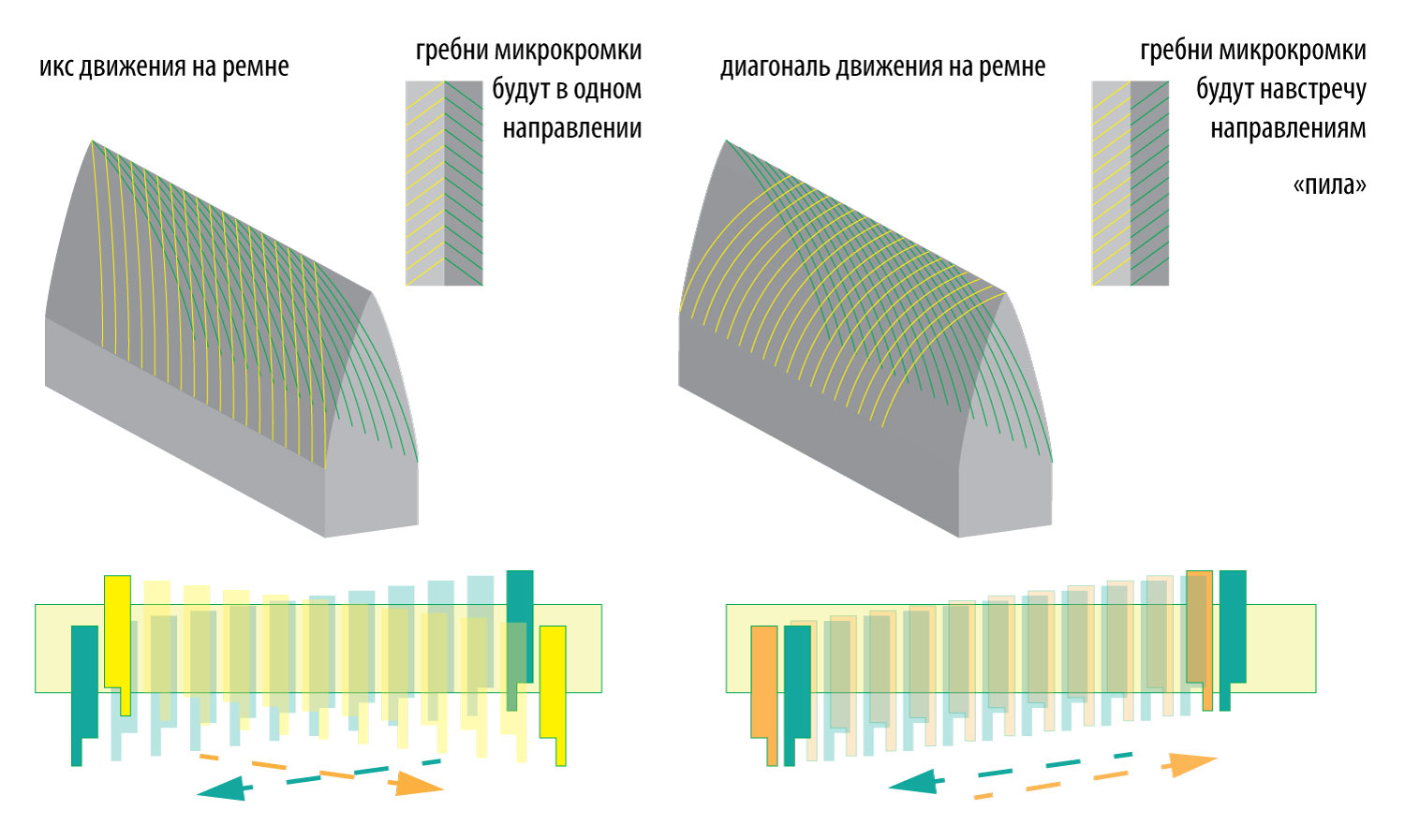 прочитал, пересмотрел, намалевано правильно. риски именно так и будут располагаться. про движение на ремне кромкой вперед нет. даже не предполагал что такой возникнет вопрос. конечно же спинкой вперед и переворачивать через спинку. уж не стал изображать. поправил картинку. стрелочки движения сделал односторонними. чтобы не вели вдруг РК вперед