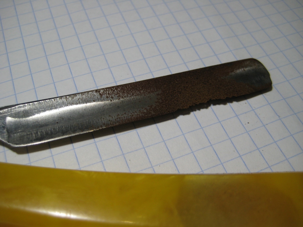 Внимание, целлулоид - убийца бритв.Довожу до сведения форумчан, что есть такая опасность, как старый целлулоид, который спустя десятилетия становится активным пожирателем стали. Вот фото такого откровенного жора. Бритва лежала сухой, в правильном шкафчике, специально оставил её для эксперимента и показа, что делает химия с бритвой ( эксперимент длился 1-1.5года).
