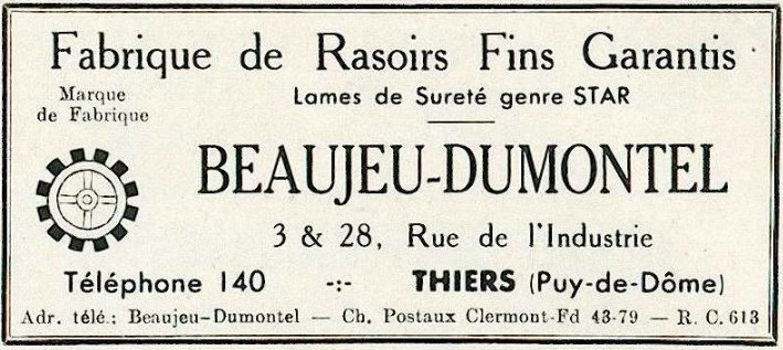http://www.delorme.fr" onclick="window.open(this.href);return false; - "Всё для профессионалов, парикмахерских и салонов красоты" На сайте о свой истории почти ничего не пишут, только общие фразы: "Мы уже более 100 лет на парикмахерской службе. В то время мы продавали опасные бритвы, маникюрные ножницы, шампуни, мыло, масло для волос и бороды. Клиенты были в основном работники парикмахерских." Сейчас это большая фирма, 500 000 евро уставной капитал, два филиала, занимаются тем же и находятся по тому же адресу. Вот их реклама того времени, 1933 год: Бритвы, конечно же, делали не сами, а размещали заказы в Тьере. Picador, 1927 год. В регистрационном листе написано: Регистрация торговой марки: Я, нижеподписавшийся, Beaujeu-Dumontel, промышленник и гражданин Тьера, действую от имени Robert Delorme, из Парижа, улица passage de l'Industrie, 22. Beaujeu-Dumontel это владелец большого завода по производству бритв: Всего, по такому поручению, на имя Beaujeu Dumontel было зарегистрировано 14 торговых марок: в 1924 году: THE STARTER, CRISTAL, L'INDUSTRIE ROYALE, Le Petit Parisien, EXTRA DRY, SUPER SALOON, PRIM'RAZ, VICTORY, Tout va bien в 1927 году: PICADOR 80 RO DELORME PARIS - основная марка, которая ставилась на эрле в 1928 году: DIXI, TITUS, CHARLESTON Spoiler Show Но не только Beaujeu Dumontel выпускал для них бритвы. Вот бритва выпущенная фирмой Thiers Issard: Возможно выпускал и кто-то еще. На ранних бритвах ставилось клеймо "R. Delorme Paris" Ну, а сам Robert Delorme (поставщик для парикмахерских), основатель фирмы, умер 6 декабря 1943 года. Вот найденный некролог: Re: Robert Delorme, Parisнесколько фоток бритв в коллекцию: