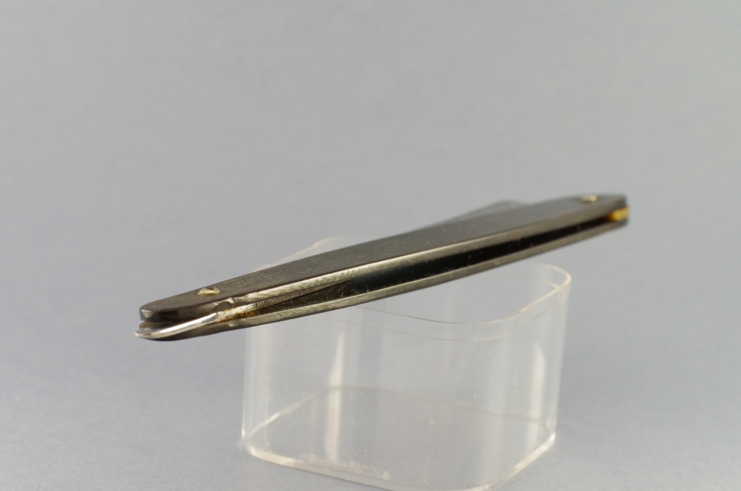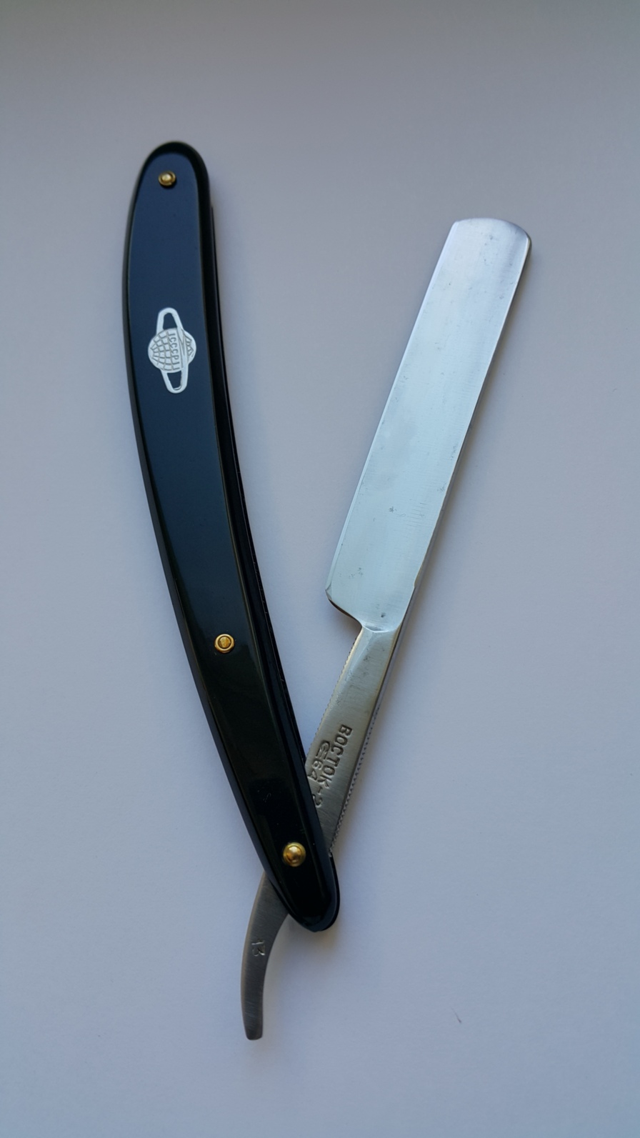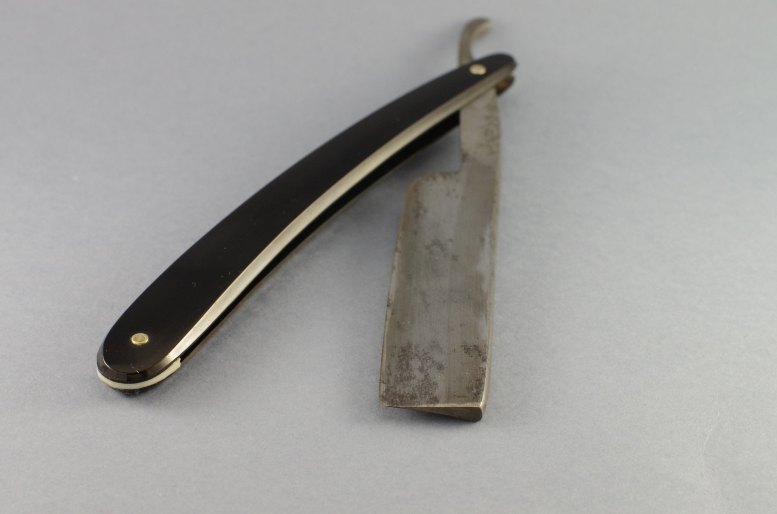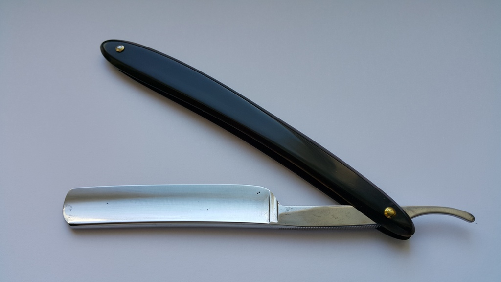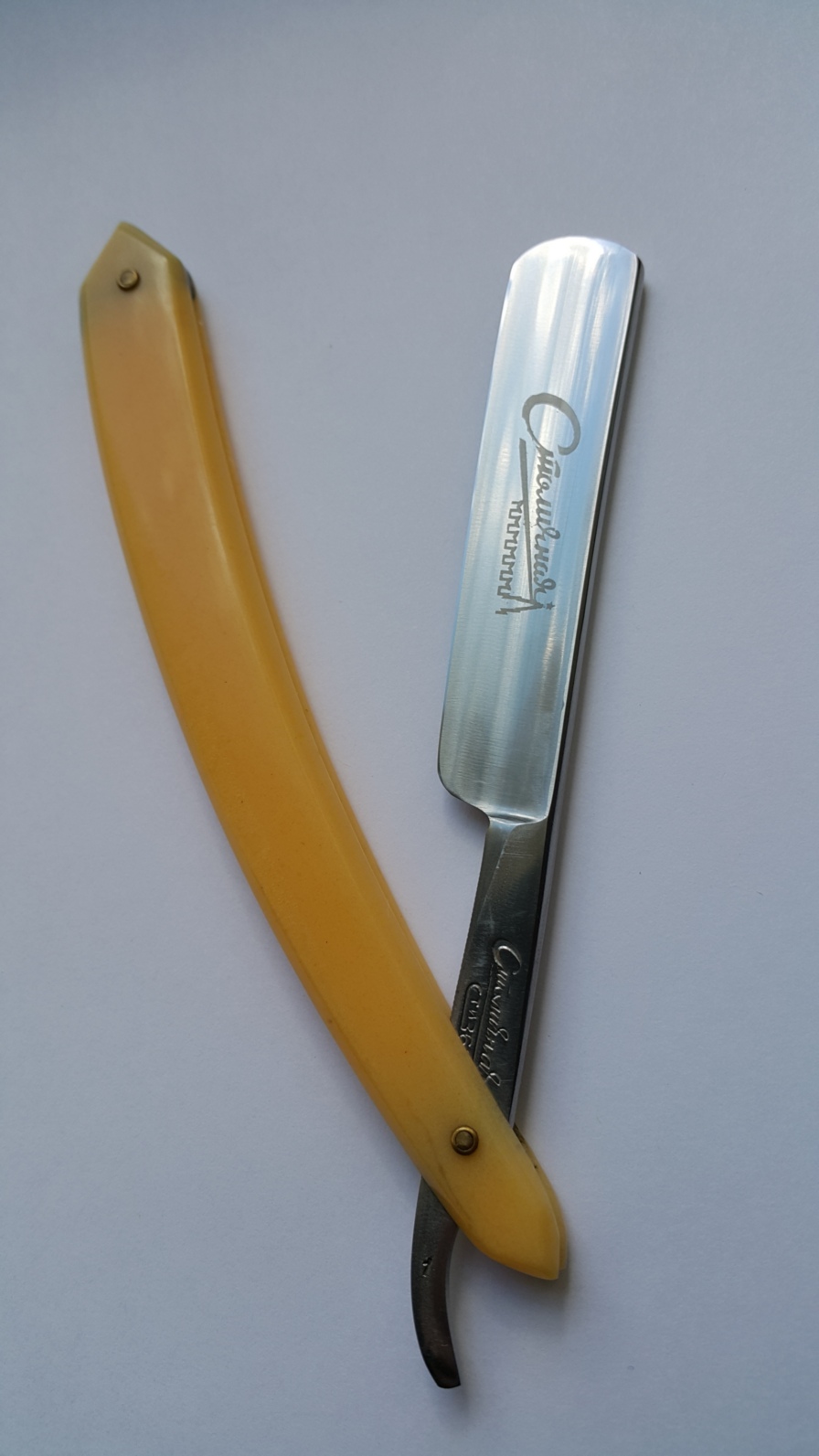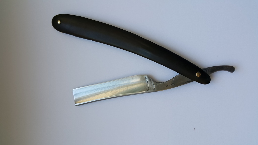 Бритва полностью в рабочем состоянии. Ручка целая, ровная, клинок паркуется по центру, без закусываний. На осевом пине сидит достаточно плотно, под собственным весом не вываливается. Парковка сделана утыканием носика бритвы в клинышек ручки. Насечка с двух сторон эрля. Длина рабочей кромки 8 см. Длина ручки 15 см, длина клинка 14,5. Обух 5+ мм. Увесистая бритва, 54 грамма.