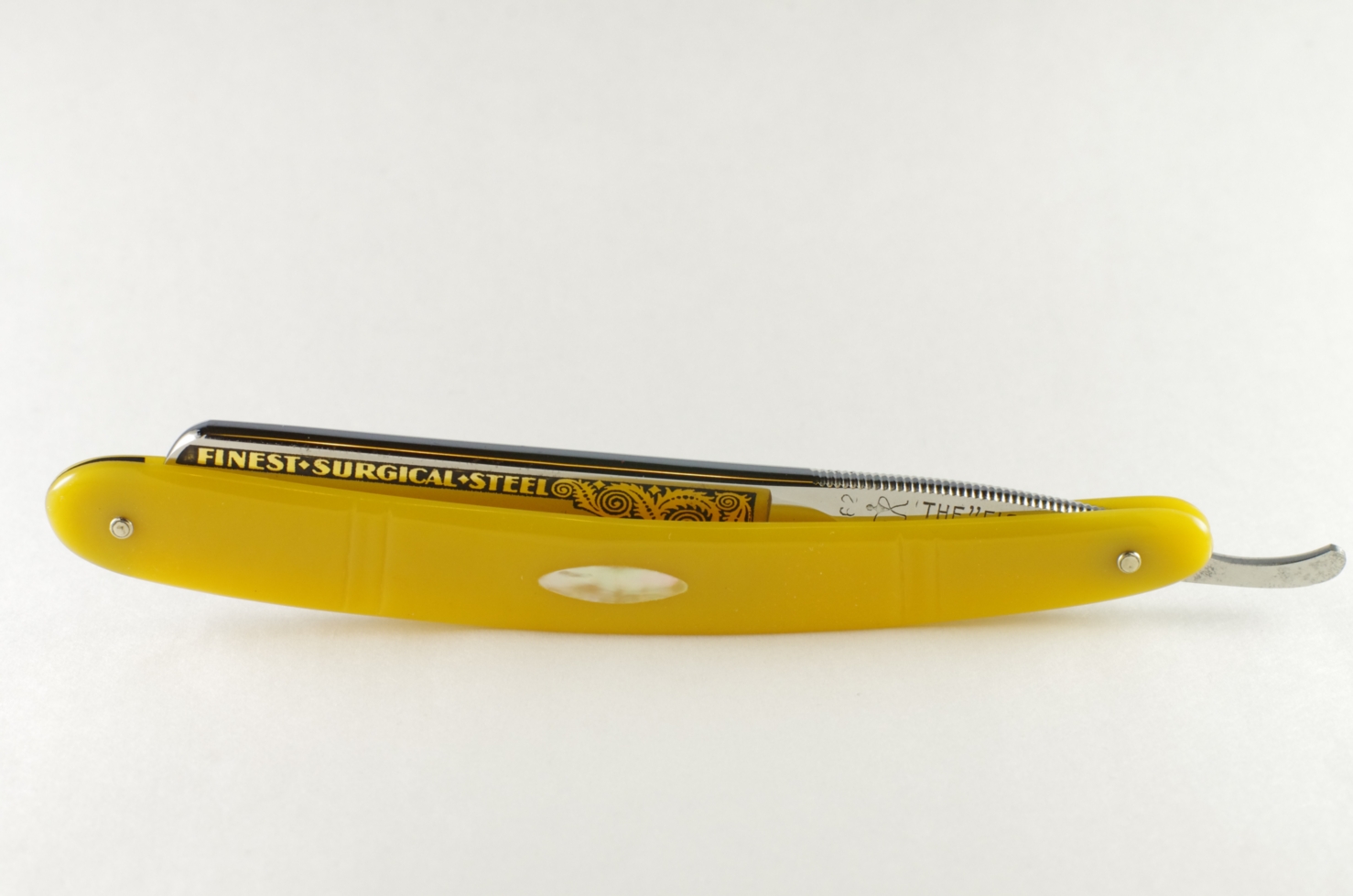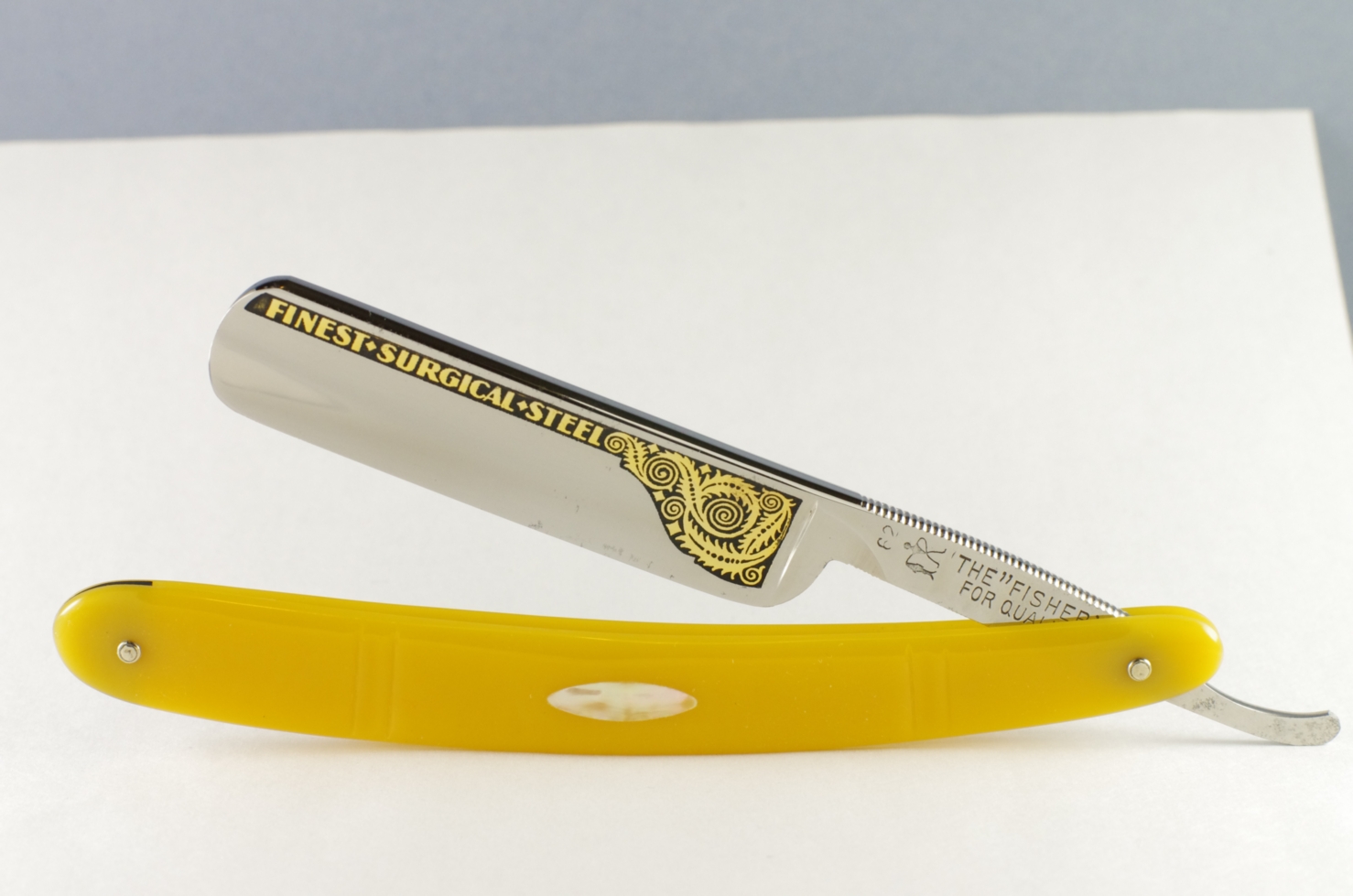 9. Бритва Fisher #62, Германия. Бритва из парного комплекта, одну оставлю себе, вторую продаю. Размер 11/16, ручка из пластика с перламутровой вставкой. На клинке декоративное травление, "золотом" на черном. Насечка с обеих сторон эрля. Без футляра. Бритва почти совсем без следов износа, не разбиралась, не полировалась и пр., ничего не заменено, только отмыт жировой слой загрязнений. Бритва не заточена.