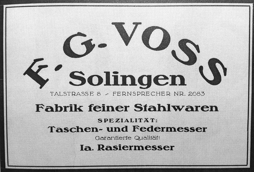 F. G. Voss SolingenОб этой фирме известно не много. с 1900 по 1914 годы бизнес принадлежал F.G. Voss и сыну с 1920 по 1939 год владельцем был Karl Voss (с 1914 по 1920 - Первая Мировая война, вероятно бизнеса не было или данные отсутствуют) адреса в Золингене: Thalstrasse 7 в 1901 году, Taistrasse 8 в 1922 году, Oligschlagerweg 7/8 в 1939 году. Из рекламы 1922 года ( на картинке выше) видно, что занимались карманными, перочинными ножами и бритвами. источник: справочник J. A. Carter Spoiler Show Кто сейчас на конференцииСейчас этот форум просматривают: нет зарегистрированных пользователей и 3 гостя | |
