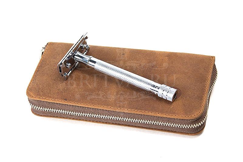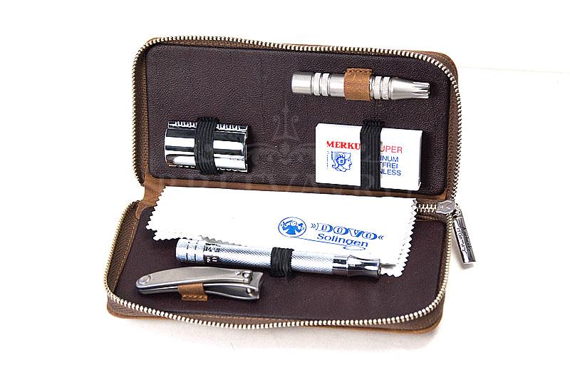 В комплекте: Т-образная бритва "прямой срез" с удлинённой ручкой, 10 лезвий Merkur Super, механическая машинка для стрижки волос в носу и ушах и книпсер. Машинка и книпсер матовые. Чехол сделан из натуральной кожи, коричневый.