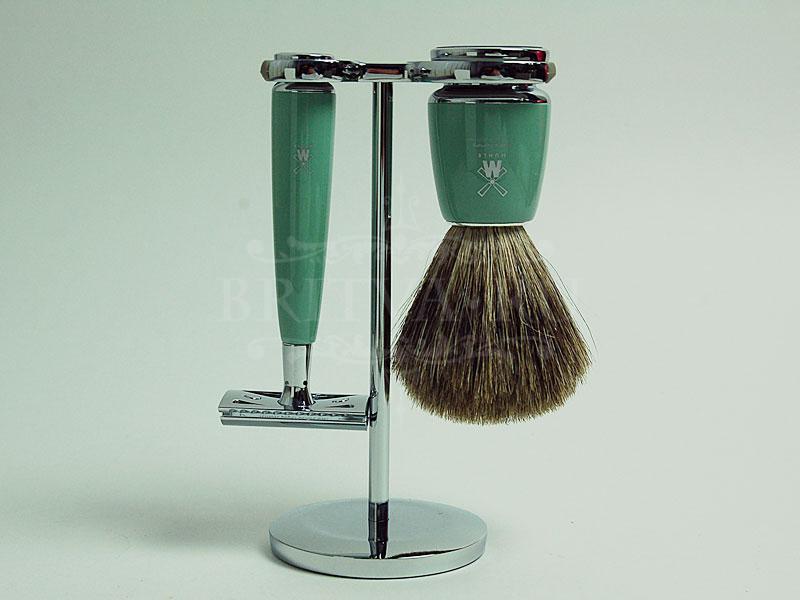 Высококачественный элитный бритвенный набор из серии RYTMO. В комплекте Т-образный станок для бритья "прямой срез" с ручкой из синтетической смолы, кисточка-помазок для бритья из натуральной щетины барсука с ручкой из синтетической смолы и удобная хромированная металлическая подставка. Цвет смолы - мятный.