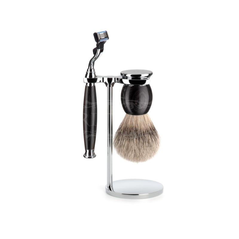 Высококачественный элитный бритвенный набор серии Sophist, адаптированный под бритвенную систему Gillette Mach3. В комплекте станок для бритья, кисточка-помазок для бритья из высококачественной щетины барсука ("Серебряный барсук"), удобная подставка из хромированного металла. Ручки помазка и станка сделаны из африканского чёрного дерева Гренадилла, с металлическими хромированными вставками.