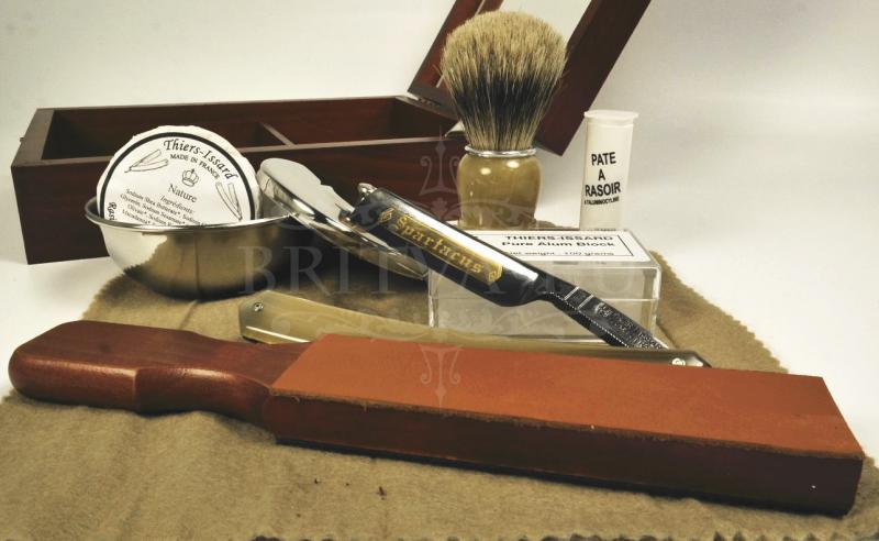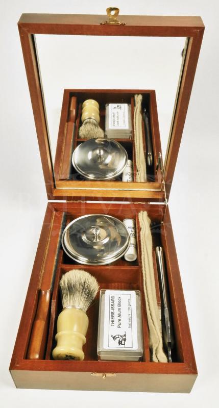 Элитный набор для бритья в деревянной шкатулке ручной работы, разработанной и произведённой фабрикой Thiers-Issard. Набор представляет собой воспроизведённую копию набора для любителя бритья опасной бритвой начала 20 века. Обладание таким набором в то время было показателем высочайшего статуса мужчины в обществе, он использовался как дома, так и в путешествиях. Настоящий набор джентльмена! В набор входят: металлическая чашечка с крышкой для взбивания пены, мыло для бритья без ароматических добавок (84г. брутто), алюмокалиевые квасцы для остановки крови (125г.) в пластиковом футляре, двухсторонний мини-ремешок для правки, паста белая для полировки, 1 кисточка-помазок "Серебряный барсук" с ручкой из светлого рога, 1 опасная бритва Thiers-Issard Spartacus шириной 5/8" с вогнутостью 1/1 со светлой ручкой из рога. Предусмотрено 1 отделение для 2-ой опасной бритвы. Отдельного внимания заслуживает шкатулка. Изготовленная вручную из твердых пород дерева, она отлично подходит для хранения и транспортировки опасных бритв и аксессуаров для бритья. В крышку шкатулки встроено полноразмерное зеркало. При желании вместо второй опасной бритвы в набор можно поместить расчёску.