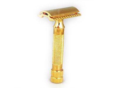 Классическая Т-образная безопасная бритва. Изготовлена из нержавеющей стали, покрыта позолотой. В комплект входит одно лезвие Merkur Super (Made in Germany). Бритва оснащена зажимом лезвия на резьбе.