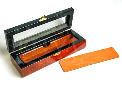 Деревянный футляр ручной работы для хранения одной опасной бритвы. Искусно изготовленный из твердых пород дерева футляр отлично подходит для хранения опасной бритвы. Помимо ярко выраженных эстетических качеств, футляр довольно практичен: толстые стенки защищают набор бритв от влаги и пыли, а дерево является материалом, отлично абсорбирующим влагу. В крышке предусмотрено стекло для обзора бритвы. Бритва ложится в специальный паз. Для более плотного и надежного крепления в футляре предусмотрен кожаный коврик. Надёжные металлические петли позволят изделию служить долгие годы. Замком служит маленькая резная позолоченная защёлка.