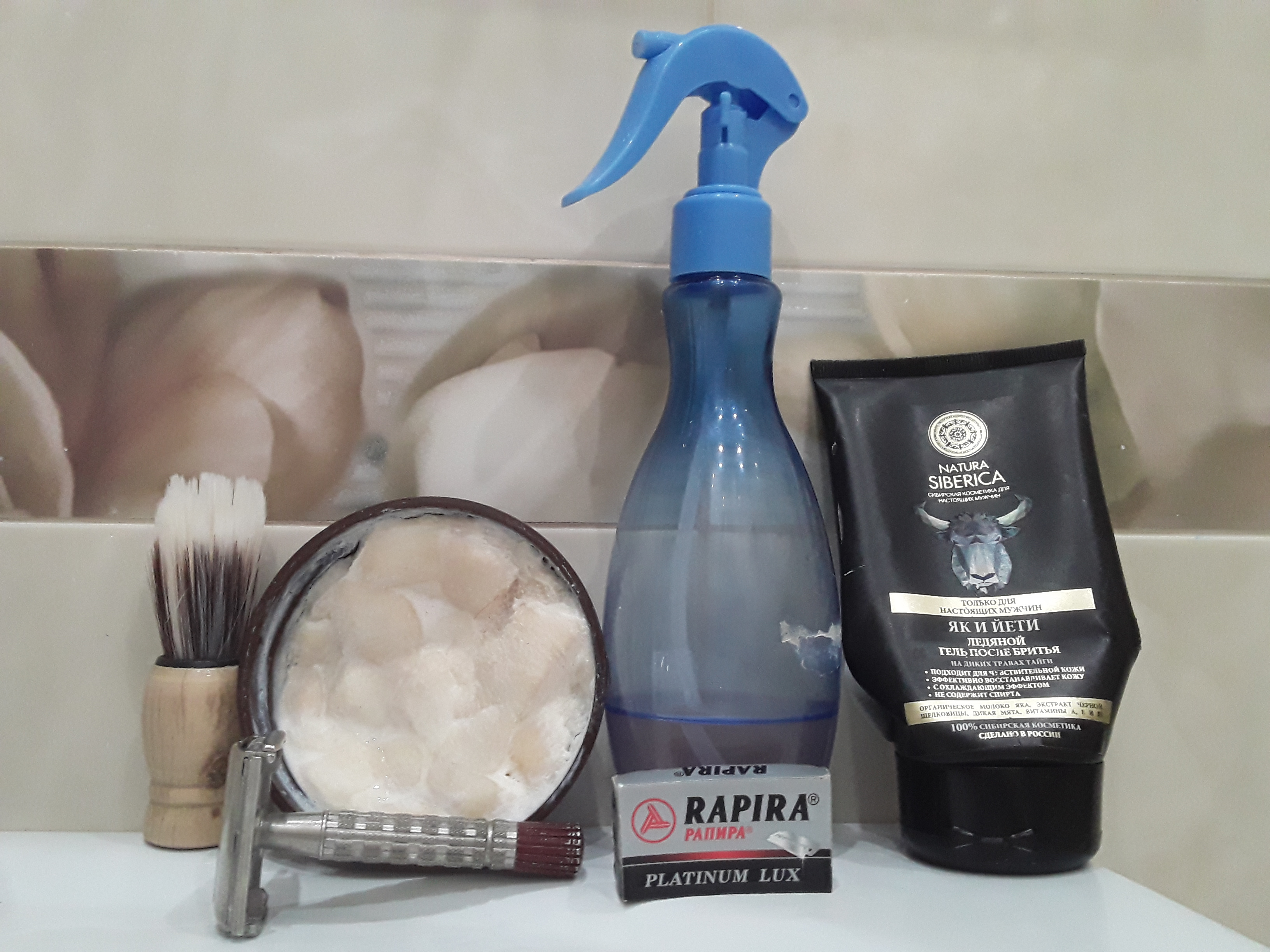 Станок: Gillette Super Speed Red tip, Лезвие:РПЛ, Помазок: no name из Ашана(синтетика), Мыло: ТДС Кремовое: Ментол, Афтершейв: Розовый лосьон от НЗ, гель Як и Йети.