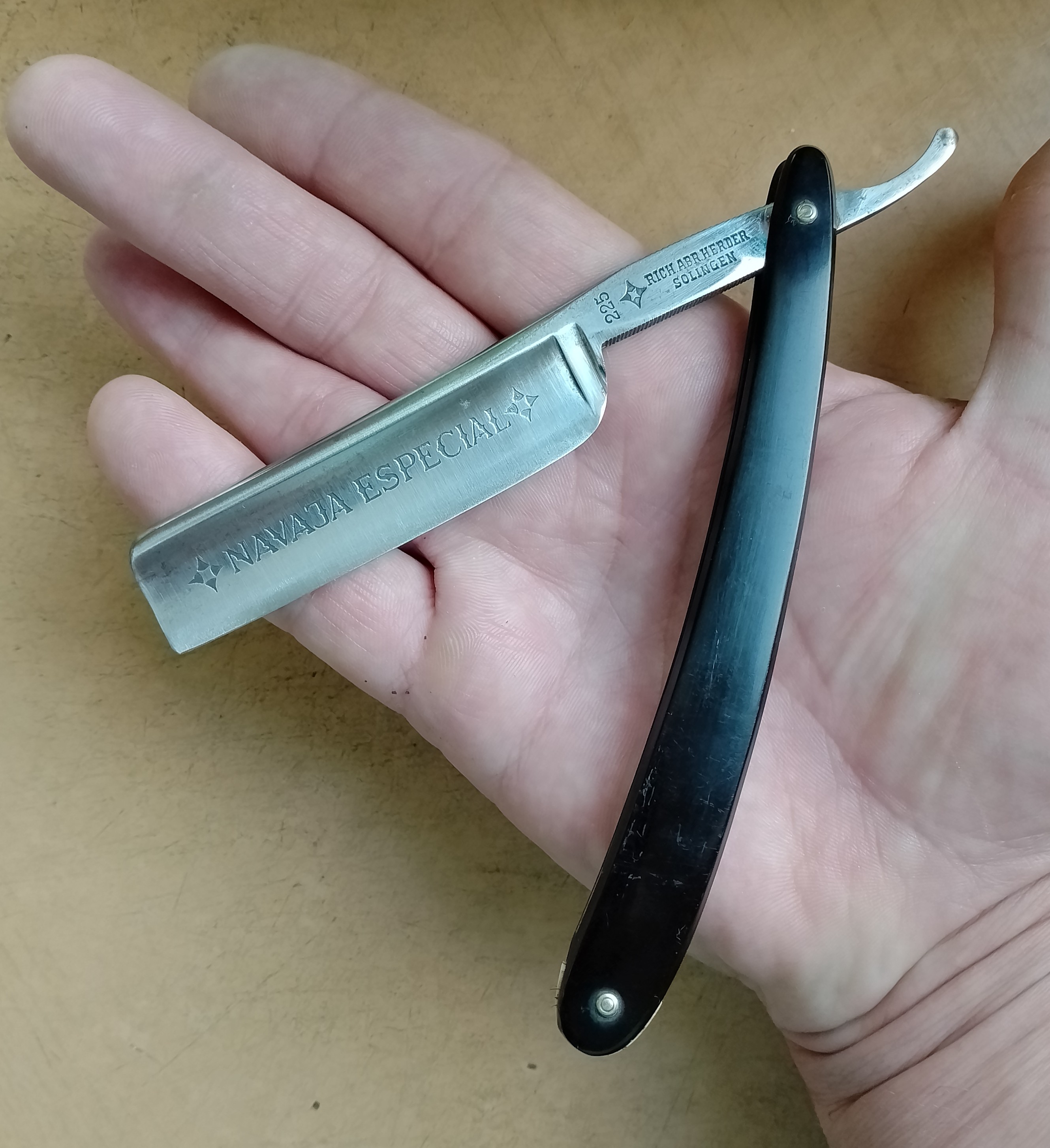 Бритва до... и после...Попался в работу английский клинок ориентировочно 1825 года. Какой-то умелец пытался из него сделать типа псевдофрейм жестоким образом на точиле. Как смог реанимировать. Поставил китовый ус и клинышек из мамонта. IMG_20230830_183406.jpg IMG_20230830_183406~2.jpg IMG_20231013_083001.jpg IMG_20231013_...