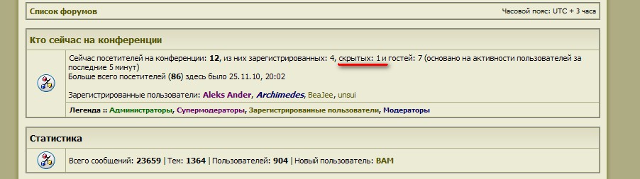 Re: Кто тут у нас шифруется?Работает оно легко - при проставленной галочке все посетители вместо никнейма того кто сейчас на форуме выдят надпись типа на форуме 20 челов, из них 4 зарегистрированные пользователи, один скрытый и 15 не зарегистрированных. Такое есть на всех движках.
