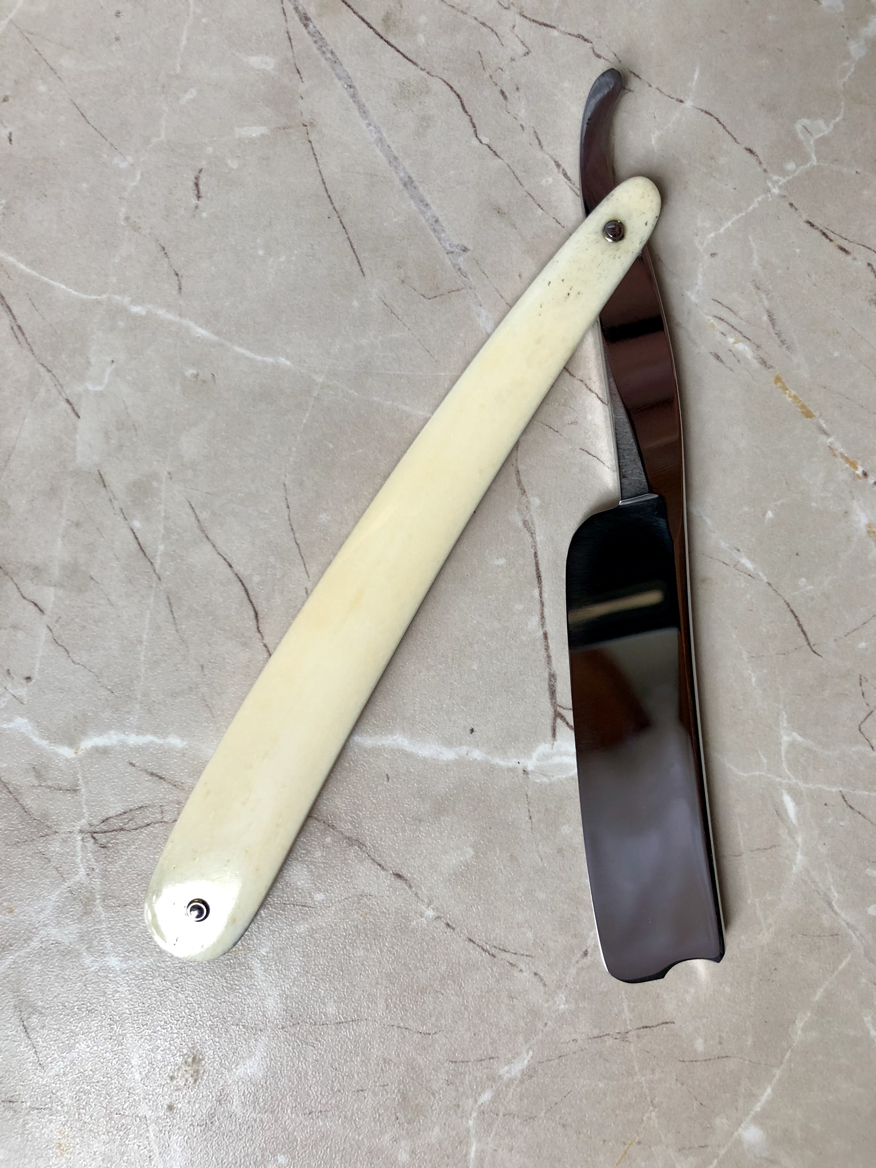 Представлю ещё одну работу, только немного поспешил фото до не сделал. Но бритва очень интересная на мой взгляд, немного почистил клинок, ручки кость верблюда, клин новый, и пины.