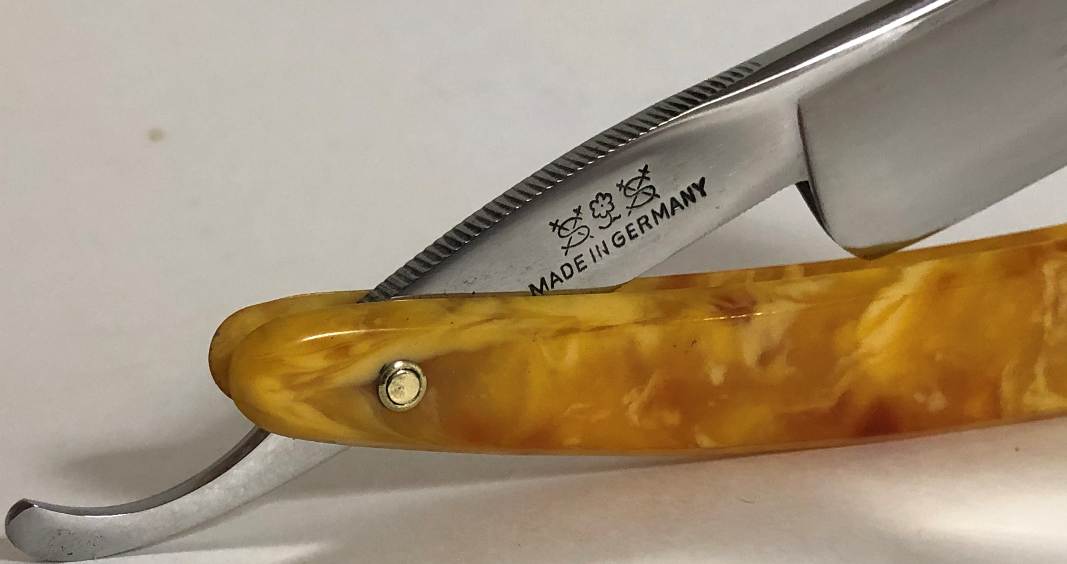 Бритва до... и после..."Протёр тряпочкой"сегодня одного почтенного и мощного немца.Клинок изначально был подвергнут попытке неправильной и грубой заточки, что привело к образованию у кромки большого количества глубоких рисок, которые нужно было аккуратно свести, чтобы не уточить вусмерть клинок, либо не довести металл до состояния фольги, при котором невозможно было бы нормально заточить бритву.Вроде все прошло удачно, и старичок ещё может послужить..